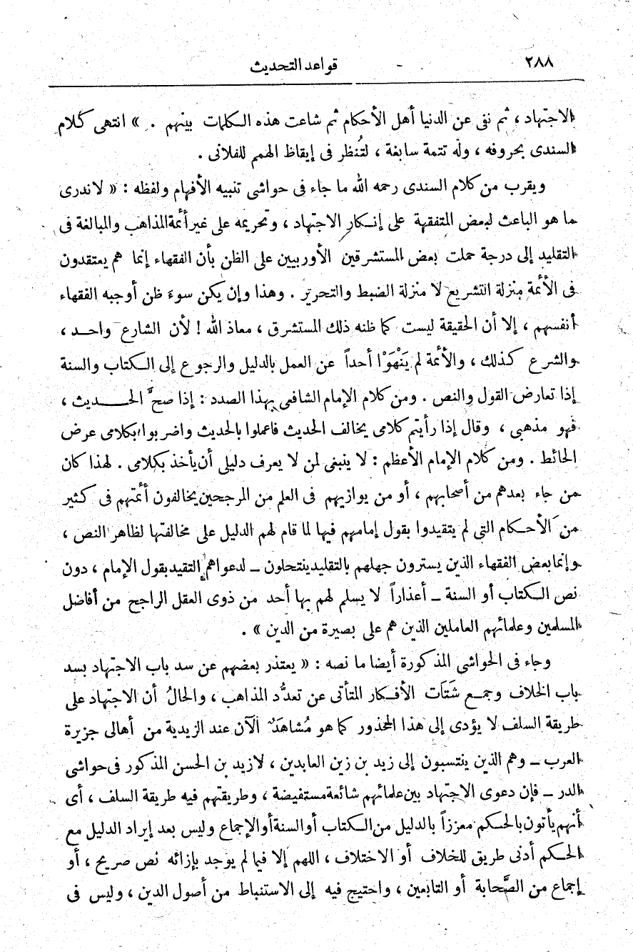 ويقرب من كلام السندي رحمه الله ما جاء في حواشي تنبيه الأفهام ولفظه: "لا ندري ما هو الباعث لبعض المتفقهة على إنكار الاجتهاد وتحريمه على غير أئمة المذاهب، والمبالغة في التقليد إلى درجة حملت بعض المستشرقين الأوروبيين على الظن بأن الفقهاء إنما هم يعتقدون في الأئمة منزلة التشريع لا منزلة الضبط، والتحرير وهذا وإن يكن سوء ظن أوجبه الفقهاء أنفسهم إلا أن الحقيقة ليست كما ظنه ذلك المستشرق معاذ الله لأن الشارع، واحد والشرع كذلك والأئمة لم ينهوا أحدًا عن العمل بالدليل، والرجوع إلى الكتاب والسنة إذا تعارض القول والنص، ومن كلام الإمام الشافعي بهذا الصدر إذا صح الحديث فهو مذهبي، وقال: إذا رأيتم كلامي يخالف الحديث فاعملوا بالحديث، واضربوا بكلامي عرض الحائط، ومن كلام الإمام الأعظم لا ينبغي لمن لا يعرف دليلي أن يأخذ بكلامي لهذا كان من جاء بعدهم من أصحابهم أو من يوازيهم في العلم من المرجحين يخالفون أئمتهم في كثير من الأحكام التي لم يتقيدوا بقول إمامهم فيها لما قام لهم الدليل على مخالفتها لظاهر النص، وإنما بعض الفقهاء الذين يسترون جهلهم بالتقليد ينتحلون -لدعواهم التقيد بقول الإمام دون نص الكتاب أو السنة- أعذارًا لا يسلم لهم بها أحد من ذوي العقل الراجح من أفاضل المسلمين وعلمائهم العاملين الذين هم على بصيرة من الدين".