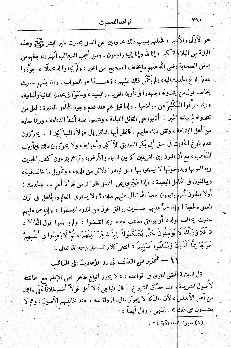 قال العلامة الفلاني في: "إيقاظ الهمم": "لو تتبع الإنسان من النقول لوجد أكثر مما ذكر، ودلائل العمل على الخبر أكثر من أن تذكر، وأشهر من أن تشهر لكن لبس إبليس على كثير من البشر فحسن لهم الأخذ بالرأي لا الأثر وأوهمهم أن هذا هو الأولى والأخير، فجعلهم بسبب ذلك محرومين عن العمل بحديث خير البشر -صلى الله عليه وسلم- وهذه البلية من البلايا الكبر، إنا لله وإنا إليه راجعون، ومن أعجب العجائب أنهم إذا بلغهم من بعض الصحابة -رضي الله عنهم- ما يخالف الصحيح من الخبر، ولم يجدوا له محملًا جوزوا عدم بلوغ الحديث إليه، ولم يثقل ذلك عليهم، وهذا هو الصواب وإذا بلغهم حديث يخالف قول من يقلدونه اجتهدوا في تأويله القريب والبعيد وسعوا في محامله النائية والدانية وربما حرفوا الكلم عن مواضعها، وإذا قيل لهم عند عدم وجود المحامل المعتبرة لعل من تقلدونه لم يبلغه الخبر أقاموا على القائل القيامة، وشنعوا عليه أشد الشناعة، وربما جعلوه من أهل البشاعة، وثقل ذلك عليهم فانظر أيها العاقل إلى هؤلاء المساكين يجوزون عدم بلوغ الحديث في حق أبي بكر الصديق الأكبر، وأحزابه ولا يجوزون ذلك في أرباب المذاهب مع أن البون بين الفريقين كما بين السماء والأرض، وتراهم يقرءون كتب الحديث ويطالعونها ويدرسونها لا ليعملوا بها بل ليعلموا دلائل من قلدوه، وتأويل ما خالف قوله ويبالغون في المحامل البعيدة، وإذا عجزوا عن المحمل قالوا من قلدنا أعلم منا بالحديث ألا يعلمون أنهم يقيمون حجة الله تعالى عليهم بذلك، ولا يستوي العالم والجاهل في ترك العمل بالحجة وإذا مر عليهم حديث يوافق قول من قلدوه انبسطوا وإذا مر عليهم حديث يخالف قوله أو يوافق مذهب غيره ربما انقبضوا ولم يسمعوا قول الله1: {فَلا وَرَبِّكَ لا يُؤْمِنُونَ حَتَّى يُحَكِّمُوكَ فِيمَا شَجَرَ بَيْنَهُمْ ثُمَّ لا يَجِدُوا فِي أَنْفُسِهِمْ حَرَجًا مِمَّا قَضَيْتَ وَيُسَلِّمُوا تَسْلِيمًا} انتهى كلام السندي رحمه الله تعالى.