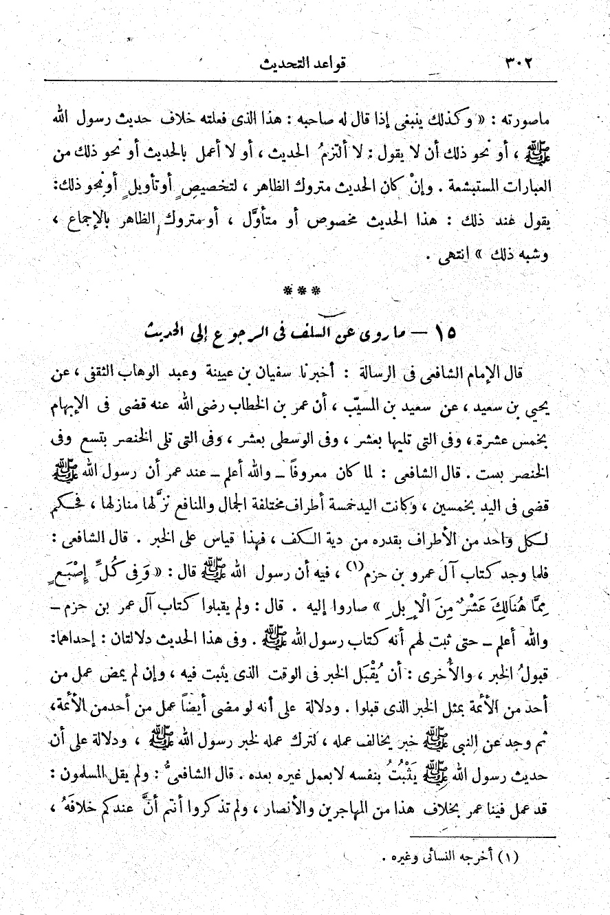 قال الإمام الشافعي في الرسالة أخبرنا سفيان بن عيينة، وعبد الوهاب الثقفي عن يحيى بن سعيد عن سعيد بن المسيب أن عمر بن الخطاب -رضي الله عنه- قضى في الإبهام بخمس عشرة، وفي التي تليها بعشر وفي الوسطى بعشر، وفي التي تلي الخنصر بتسع وفي الخنضر بست قال الشافعي لما كان معروفًا والله أعلم عند عمر أن رسول الله -صلى الله عليه وسلم- قضى في اليد بخمسين، وكانت اليد خمسة أطراف مختلفة الجمال والمنافع نزلها منازلها فحكم لكل واحد من الأطراف بقدره من دية الكف فهذا قياس على الخبر قال الشافعي: فلما وجد كتاب آل عمرو بن حزم1 فيه أن رسول الله -صلى الله عليه وسلم- قال: "وفي كل إصبع مما هنالك عشر من الإبل" صاروا إليه قال: ولم يقبلوا كتاب آل عمر بن حزم والله أعلم حتى ثبت لهم أنه كتاب رسول الله -صلى الله عليه وسلم- وفي هذا الحديث دلالتان إحداهما قبول الخبر والأخرى أن يقبل الخبر في الوقت الذي يثبت فيه وإن لم يمض عمل من أحد من الأئمة بمثل الخبر الذي قبلوا، ودلالة على أنه لو مضى أيضًا عمل من أحد من الأئمة ثم وجد عن النبي خبر يخالف عمله لترك عمله لخبر رسول الله -صلى الله عليه وسلم- ودلالة على أن حديث رسول الله -صلى الله عليه وسلم- يثبت بنفسه لا بعمل غيره بعده قال الشافعي: ولم يقل المسلمون قد عمل فينا عمر بخلاف هذا من المهاجرين والأنصار ولم تذكروا أنتم أن عندكم خلافه،