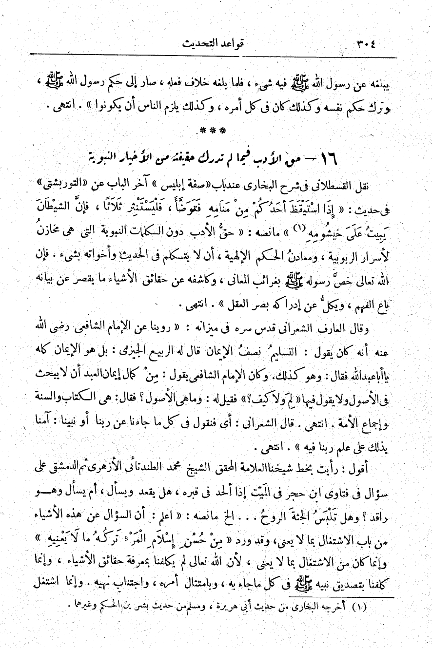نقل القسطلاني في شرح البخاري عند باب: "صفة إبليس" آخر الباب عن: "التوربشتي" في حديث: "إذا استيقظ أحدكم من منامه فتوضأ فليستنثر ثلاثًا، فإن الشيطان يبيت على خيشومه" 1 ما نصه: "حق الأدب دون الكلمات النبوية التي هي مخازن لأسرار الربوبية ومعادن الحكم الإلهية أن لا يتكلم في الحديث وإخوانه بشيء فإن الله تعالى خص رسوله -صلى الله عليه وسلم- بغرائب المعاني وكاشفة عن حقائق الأشياء ما يقصر عن بيانه باع الفهم ويكل عن إدراكه بصر العقل". ا. هـ.