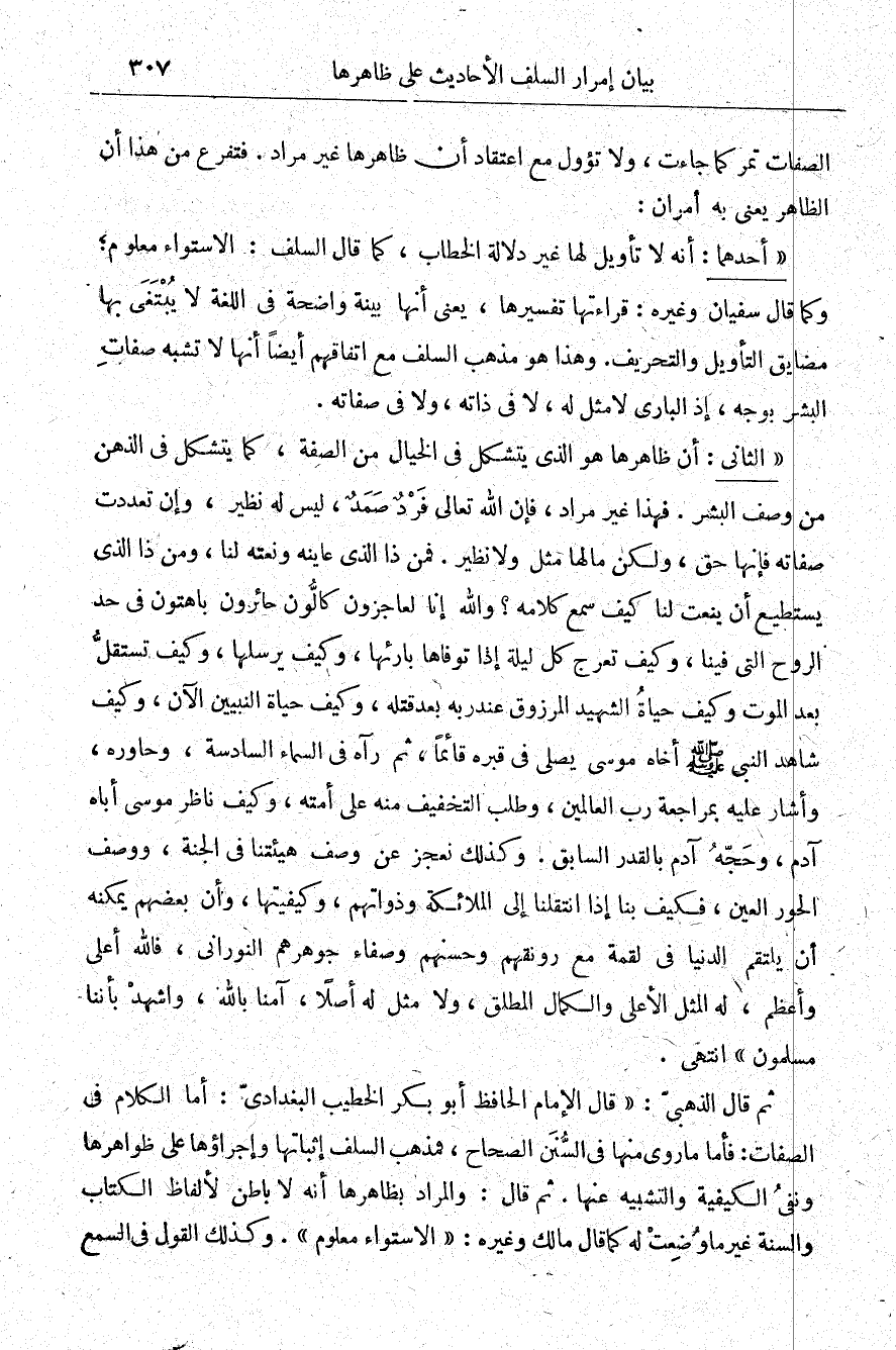 ثم قال الذهبي: "قال الإمام الحافظ أبو بكر الخطيب البغدادي: أما الكلام في كل لصفات: فأما ما روى منها في السنن الصحاح، فمذهب السلف إثباتها وإجراؤها على ظواهرها نفى الكيفية والتشبيه عنها. ثم قال: والمراد بظاهرها أنه لا باطن لألفاظ الكتاب السنة غير ما وضعت له كما قال مالك وغيره: "الاستواء معلوم" وكذلك القول في السمع والبصر والعلم، والكلام والإرادة والوجه ونحو ذلك. هذه الأشياء معلومة فلا تحتاج إلى بيان وتفسير، لكن الكيف في جميعها مجهول عندنا. وقد نقل الذهبي في كتابه المذكور هذا المذهب عن مائة وخمسين إمامًا بدأ منهم بأبي حنيفة -رضي الله عنهم- وختم بالقرطبي فانظره.