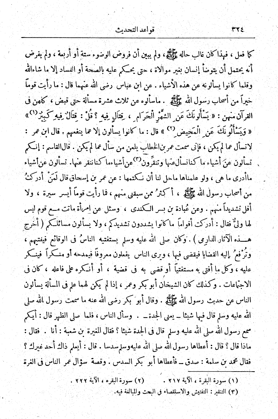 كما فعل فهذا كان غالب حاله -صلى الله عليه وسلم- ولم يبين أن فروض الوضوء ستة أو أربعة، ولم يفرض أنه يحتمل أن يتوضأ إنسان بغير موالاة، حتى يحكم عليه بالصحة أو الفساد إلا ما شاء الله وقلما كانوا يسألونه عن هذه الأشياء. عن ابن عباس -رضي الله عنهما- قال: ما رأيت قومًا خيرًا من أصحاب رسول الله -صلى الله عليه وسلم- ما سألوه عن ثلاث عشرة مسألة حتى قبض كلهن في القرآن منهن: {يَسْأَلُونَكَ عَنِ الشَّهْرِ الْحَرَامِ قِتَالٍ فِيهِ قُلْ قِتَالٌ فِيهِ كَبِيرٌ} 1، {وَيَسْأَلُونَكَ عَنِ الْمَحِيض} 2 قال: ما كانوا يسألون إلا عما ينفعهم قال ابن عمر: لا تسأل عما لم يكن فإني سمعت عمر بن الخطاب يلعن من سأل عما لم يكن قال القاسم: إنكم تسألون عن أشياء ما كنا نسأل عنها وتنقرون3 عن أشياء ما كنا ننقر عنها، تسألون عن أشياء ما أدري ما هي، ولو علمناها ما حل لنا أن نكتمها عن عمر بن إسحاق قال: لمن أدركت من أصحاب رسول الله -صلى الله عليه وسلم- أكثر ممن سبقني منهم فما رأيت قومًا أيسر سيرة، ولا أقل تشديدًا منهم، وعن عبادة بن بسر الكندي، وسئل عن امرأة ماتت مع قوم ليس لها ولي فقال: أدركت أقوامًا ما كانوا يشددون تشديدكم، ولا يسألون مسائلكم "أخرج هذه الآثار الدارمي"، وكان يستفتيه الناس في الوقائع فيفتيهم وترفع إليه القضايا فيقضي فيها، ويرى الناس يفعلون معروفًا فيمدحه أو منكرًا فينكر عليه وكل ما أفتى به مستفتيًا أو قضى به في قضية أو أنكره على فاعله كان في الاجتماعات، وكذلك كان الشيخان أبو بكر وعمر إذا لم يكن لهما علم في المسألة يسألون الناس عن حديث رسول الله -صلى الله عليه وسلم- وقال أبو بكر -رضي الله عنهما- سمعت رسول الله -صلى الله عليه وسلم- قال فيها شيئا -يعني الجدة- وسأل الناس فلما صلى الظهر قال: أيكم سمع رسول الله -صلى الله عليه وسلم- قال في الجدة شيئا فقال: المغيرة بن شعبة أنا فقال: ماذا؟ قال: قال: أعطاها رسول الله -صلى الله عليه وسلم- سدسا قال: أيعلم ذاك أحد غيرك؟ فقال محمد بن سلمة: صدق - فأعطاها أبو بكر السدس وقصة سؤال عمر الناس في الغرة