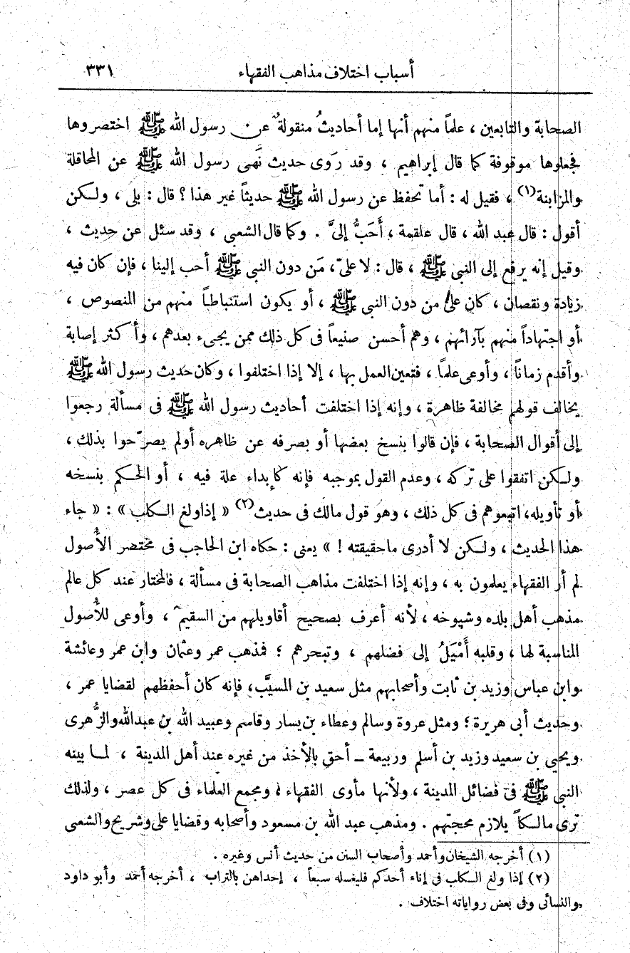 الصحابة والتابعين، علمًا منهم أنها إما أحاديث منقولة عن رسول الله -صلى الله عليه وسلم- اختصروها فجعلوها موقوفة كما قال إبراهيم، وقد روى حديث نهى رسول الله -صلى الله عليه وسلم- عن المحاقلة والمزابنة1 فقيل له أما تحفظ عن رسول الله -صلى الله عليه وسلم- حديثًا غير هذا قال: بلي، ولكن أقول قال عبد الله قال علقمة أحب إلي، وكما قال الشعبي، وقد سئل عن حديث وقيل إنه يرفع إلى النبي -صلى الله عليه وسلم- قال: لا عليَّ من دون النبي -صلى الله عليه وسلم- أحب إلينا فإن كان فيه زيادة ونقصان كان على من دون النبي -صلى الله عليه وسلم- أو يكون استنباطًا منهم من المنصوص، أو اجتهادًا منهم بآرائهم وهم أحسن صنيعًا في كل ذلك ممن يجيء بعدهم، وأكثر إصابة وأقدم زمانًا وأوعى علمًا فتعين العمل بها إلا إذا اختلفوا وكان حديث رسول الله -صلى الله عليه وسلم- يخالف قولهم مخالفة ظاهرة، وإنه إذا اختلفت أحاديث رسول الله -صلى الله عليه وسلم- في مسألة رجعوا إلى أقوال الصحابة، فإن قالوا بنسخ بعضها أو بصرفه عن ظاهره أو لم يصرحوا بذلك ولكن اتفقوا على تركه، وعدم القول بموجبه فإنه كإبداء علة فيه، أو الحكم بنسخه أو تأويله اتبعوهم في كل ذلك، وهو قول مالك في حديث2: "إذا ولغ الكلب": "جاء هذا الحديث ولكن لا أدري ما حقيقته" يعني حكاه ابن الحاجب في مختصر الأصول لم أر الفقهاء يعلمون به، وإنه إذا اختلفت مذاهب الصحابة في مسألة فالمختار عند كل عالم مذهب أهل بلده وشيوخه لأنه أعرف بصحيح أقاويلهم من السقيم وأوعى للأصول المناسبة لها، وقلبه أميل إلى فضلهم وتبحرهم فمذهب عمر وعثمان وابن عمر وعائشة وابن عباس وزيد بن ثابت وأصحابهم مثل سعيد بن المسيب فإنه كان أحفظهم لقضايا عمر وحديث أبي هريرة، ومثل عروة وسالم وعطاء بن يسار وقاسم وعبيد الله بن عبيد الله والزهري ويحيى بن سعيد وزيد بن أسلم وربيعة، أحق بالأخذ من غيره عند أهل المدينة لما بينه النبي -صلى الله عليه وسلم- في فضائل المدينة ولأنها مأوى الفقهاء ومجمع العلماء في كل عصر، ولذلك ترى مالكًا يلازم محجتهم ومذهب عبد الله بن مسعود وأصحابه وقضايا علي وشريح والشعبي