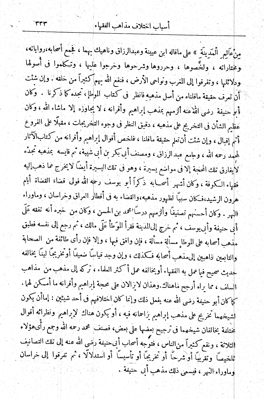 من علام المدينة" على ما قاله ابن عيينة، وعبد الرزاق وناهيك بهما، فجمع أصحابه، رواياته، ومختاراته، ولخصوها، وحرروها وشرحوها وخرجوا عليها، وتكلموا في أصولها ودلائها وتفرقوا إلى المغرب، ونواحي الأرض فنفع الله بهم كثيرًا من خلقه، وإن شئت أن تعرف حقيقة ما قلناه من أصل مذهبه فانظر في كتاب الموطأ، تجده كما ذكرنا، وكان أبو حنيفة -رضي الله عنه- ألزمها بمذهب إبراهيم، وأقرانه لا يجاوزه إلا ما شاء الله، وكان عظيم الشأن في التخريج على مذهبه دقيق النظر في وجوه التخريجات مقبلًا على الفروع أتم إقبال، وإن شئت أن تعلم حقيقة ما قلنا فلخص أقوال إبراهيم وأقرانه من كتاب الآثار لمحمد رحمه الله، وجامع عبد الرزاق ومصنف أبي بكر بن أبي شيبة ثم قايسه بمذهبه تجده لا يفارق تلك المحجة إلا في مواضع يسيرة، وهو في تلك اليسيرة أيضًا لا يخرج عما ذهب إليه فقهاء الكوفة، وكان أشهر أصحابه ذكرًا أبو يوسف رحمه الله فولى قضاء القضاة أيام هارون الرشيد فكان سببًا لظهور مذهبه، والقضاء به في أقطار العراق وخراسان، وما وراء النهر. وكان أحسنهم تصنيفًا وألزمهم درسًا محمد بن الحسن، وكان من خبره أنه تفقه على أبي حنيفة وأبي يوسف، ثم خرج إلى المدينة فقرأ الموطأ على مالك ثم رجع إلى نفسه فطبق مذهب أصحابه على الموطأ مسألة مسألة فإن وافق فيها، وإلا فإن رأى طائفة من الصحابة والتابعين ذاهبين إلى مذهب أصحابه فكذلك، وإن وجد قياسًا ضعيفًا أو تحزيجًا لينًا يخالفه حديث صحيح فيما عمل به الفقهاء، أو يخالفه عمل أكثر العلماء تركه إلى مذهب من مذاهب السلف ما يراه أرجح ما هناك، وهذان لا يزالان على محجة إبراهيم، وأقرانه ما أمكن لهما كما كان أبو حنيفة -رضي الله عنه- يفعل ذلك، وإنما كان اختلافهم في أحد شيئين إما أن يكون لشيخهما تخريج على مذهب إبراهيم يزاحمانه فيه، أو يكون هناك لإبراهيم ونظرائه أقوال مختلفة يخالفان شيخهما في ترجيح بعضها على بعض فصنف محمد رحمه الله، وجمع رأي هؤلاء الثلاثة، ونفع كثيرًا من الناس، فتوجه أصحاب أبي حنيفة -رضي الله عنه- إلى تلك التصانيف تلخيصًا وتقريبًا أو شرحًا أو تخريجًا، أو تأسيسًا أو استدلالًا ثم تفرقوا إلى خراسان، وما وراء النهر فيسمى ذلك مذهب أبي حنيفة