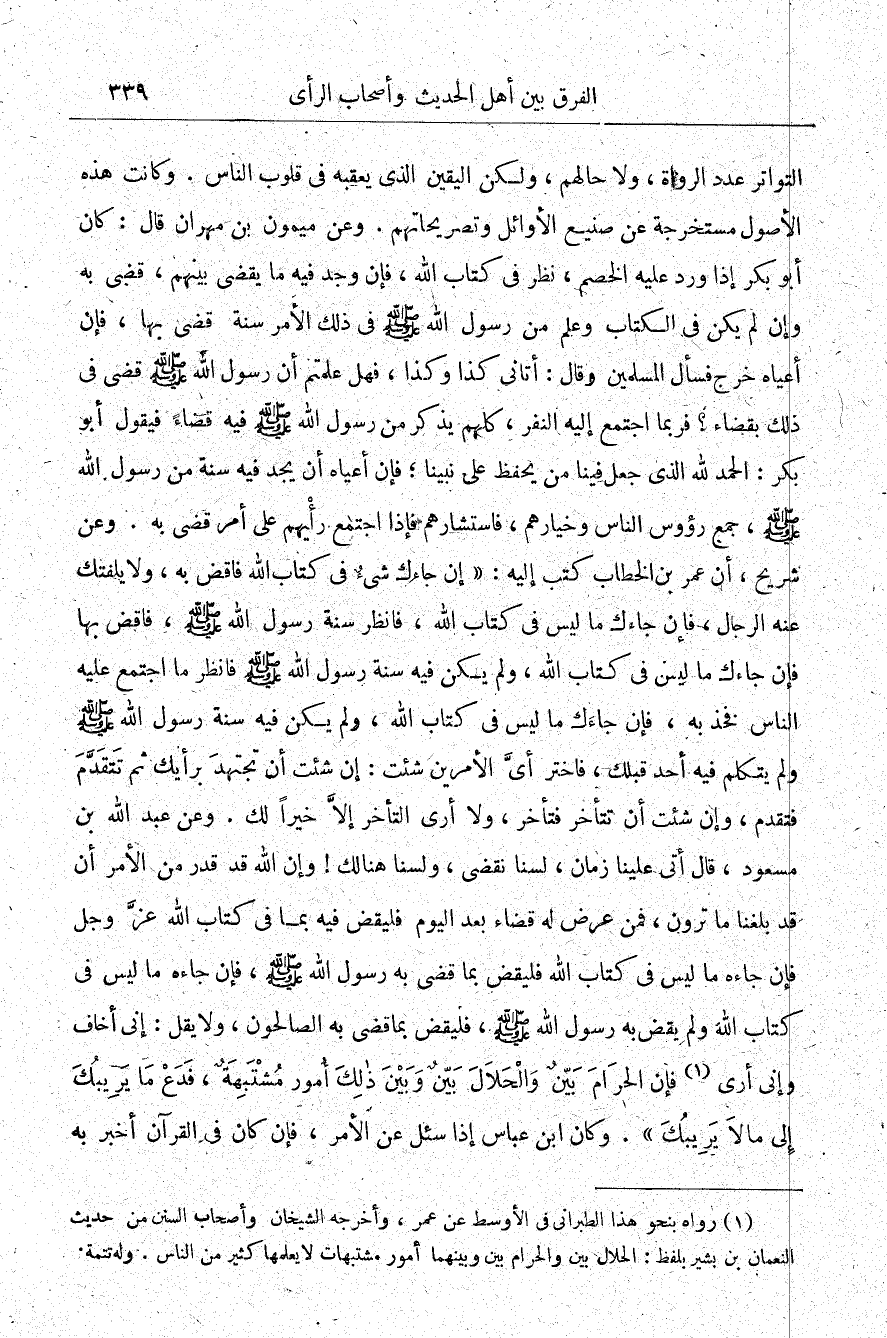 التواتر عدد الرواة، ولا حالهم ولكن اليقين الذي يعقبه في قلوب الناس. وكانت هذه الأصول مستخرجه عن صنيع الأوائل وتصريحاتهم، وعن ميمون بن مهران قال: كان أبو بكر إذا ورد عليه الخصم نظر في كتاب الله، فإن وجد فيه ما يقضي بينهم قضى به، وإن لم يكن في الكتاب وعلم من رسول الله -صلى الله عليه وسلم- في ذلك الأمر سنة قضى بها، فإن أعياه خرج فسأل المسلمين وقال: أتاني كذا وكذا فهل علمتم أن رسول الله -صلى الله عليه وسلم- قضى في ذلك بقضاء؟ فربما اجتمع إليه النفر كلهم يذكر من رسول الله -صلى الله عليه وسلم- فيه قضاء فيقول أبو بكر: الحمد لله الذي جعل فينا من يحفظ على نبينا؛ فإن أعياه أن يجد فيه سنة من رسول الله -صلى الله عليه وسلم- جمع رءوس الناس وخيارهم فاستشارهم فإذا اجتمع رأيهم على أمر قضى به، وعن شريح أن عمر بن الخطاب كتب إليه: "إن جاءك شيء في كتاب الله فاقض به. ولا يلفتك عنه الرجال، فإن جاءك ما ليس في كتاب الله ولم يكن فيه سنة رسول الله -صلى الله عليه وسلم- ولم يتكلم فيه أحد قبلك فاختر أي الأمرين شئت إن شئت أن تجتهد برأيك ثم تتقدم فتقدم، وإن شئت أن تتأخر فتأخر ولا أرى التأخر إلا خيرًا لك، وعن عبد الله بن مسعود قال أتى علينا زمان لسنا نقضي، ولسنا هنالك وإن الله قد قدر من الأمر أن قد بلغنا ما ترون فمن عرض له قضاء بعد اليوم فليقض فيه بما في كتاب الله عز وجل فإن جاءه ما ليس في كتاب الله فليقض بما قضى به رسول الله -صلى الله عليه وسلم- فإن جاءه ما ليس في كتاب الله، ولم يقض به رسول الله -صلى الله عليه وسلم- فليقض بما قضى به الصالحون ولا يقل إني أخاف وإني أرى1 فإن الحرام بين والحلال بين، وبين ذلك أمور مشتبهة فدع ما يريبك إلى ما لا يريبك" وكان ابن عباس إذا سئل عن الأمر، فإن كان في القرآن أخبر به