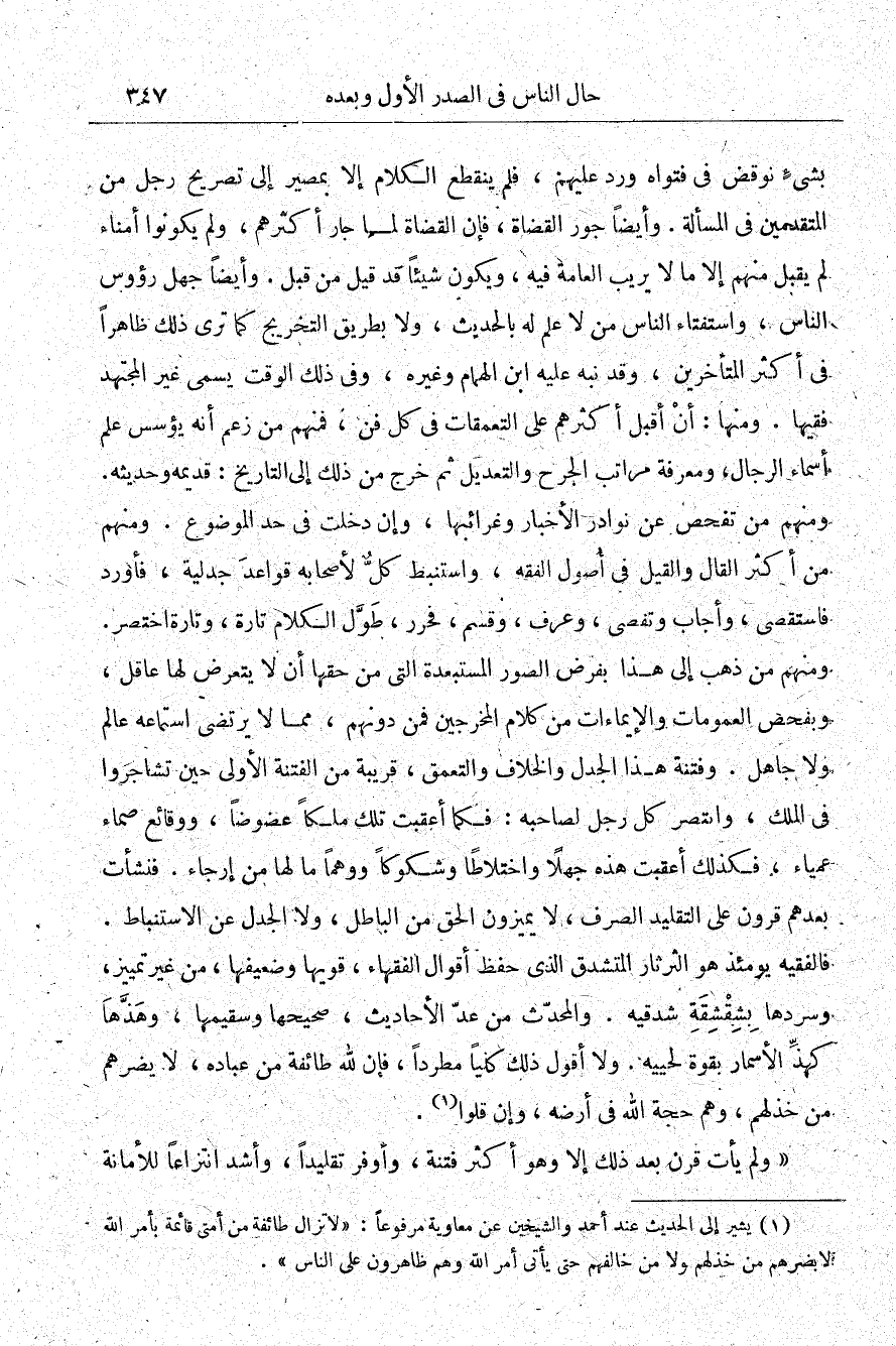 ومنهم من ذهب إلى هذا بفرض الصورة المستبعدة التي من حقها أن لا يتعرض لها عاقل، وبفحص العمومات والإيماءات من كلام المخرجين فمن دونهم، مما لا يرتضي استماعه عالم ولا جاهل. وفتنة هذا الجدل والخلاف والتعمق، قريبة من الفتنة الأولى حين تشاجروا في الملك، وانتصر كل رجل لصاحبه: فكما أعقبت تلك ملكًا عضوضًا، ووقائع صماء عمياء، فكذلك أعقبت هذه جهلًا واختلاطًا وشكوكًا ووهمًا ما لها من إرجاء. فنشأت بعدهم قرون على التقليد الصرف، لا يميزون الحق من الباطل، ولا الجدل من الاستنباط.