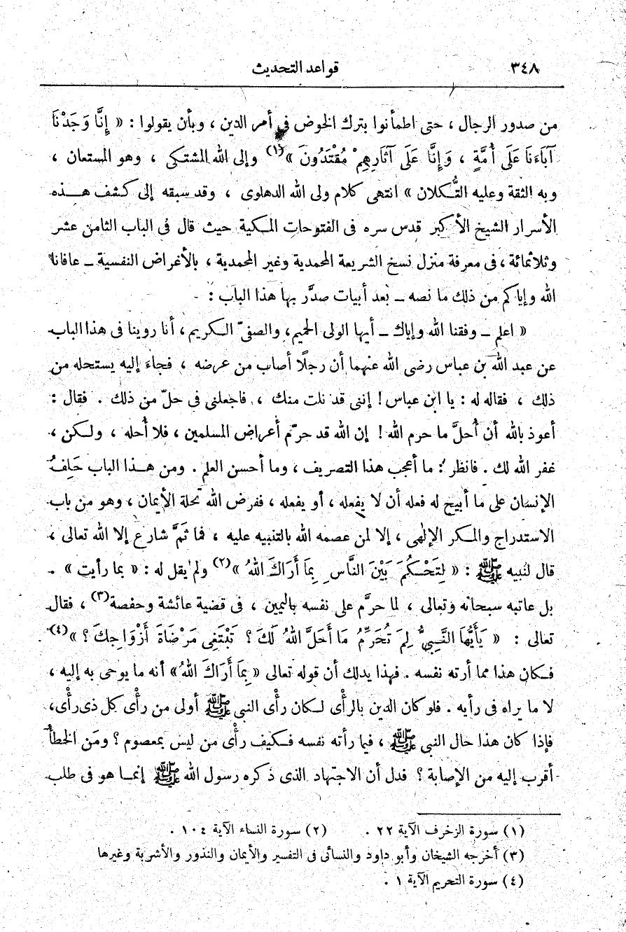 من صدور الرجال، حتى اطمأنوا بترك الخوض في أمر الدين، وبأن يقولوا: {إِنَّا وَجَدْنَا آبَاءَنَا عَلَى أُمَّةٍ وَإِنَّا عَلَى آثَارِهِمْ مُهْتَدُونَ} 1 وإلى الله المشتكى، وهو المستعان، وبه الثقة وعليه التكلان" انتهى كلام ولي الله الدهلوي، وقد سبقه إلى كشف هذه الأسرار الشيخ الأكبر قدس سره في الفتوحات المكية حيث قال في الباب الثامن عشر وثلاثمائة في معرفة منزل نسخ الشريعة المحمدية وغير المحمدية، بالأغراض النفسية -عافانا الله وإياكم من ذلك ما نصه بعد أبيات صدر بها هذا الباب: