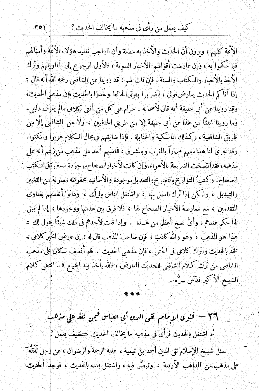 الأئمة كلهم، ويرون أن الحديث والأخذ به مضلة وأن الواجب تقليد هؤلاء الأئمة وأمثالهم فيما حكموا به، وإن عارضت أقوالهم الأخبار النبوية، فالأولى الرجوع إلى أقاويلهم وترك الأخذ بالأخبار والكتاب والسنة فإن قلت لهم قد روينا عن الشافعي -رحمه الله- أنه قال: إذا أتاكم الحديث يعارض قولي فاضربوا بقولي الحائط، وخذوا بالحديث فإن مذهبي الحديث، وقد روينا عن أبي حنيفة أنه قال لأصحابه: حرام على كل من أفتى بكلامي ما لم يعرف دليلي، وما روينا شيئًا من هذا عن أبي حنيفة إلا من طريق الحنفيين، ولا عن الشافعي إلا من طريق الشافعية، وكذلك المالكية والحنابلة فإذا ضايقهم في مجال الكلام هربوا وسكنوا، وقد جرى لنا هذا معهم مرارًا بالمغرب وبالمشرق فما منهم أحد على مذهب من يزعم أنه على مذهبه فقد انتسخت الشريعة بالأهواء، وإن كانت الأخبار الصحاح موجودة مسطرة في الكتب الصحاح، وكتب التواريخ بالتجريح والتعديل موجودة والأسانيد محفوظة مصونة من التغيير والتبديل، ولكن إذا ترك العمل بها، واشتغل الناس بالرأي ودانوا أنفسهم بفتاوى المتقدمين مع معارضة الأخبار الصحاح لها فلا فرق بين عدمها ووجودها إذا لم يبق لها حكم عندهم، وأي نسخ أعظم من هذا، وإذا قلت لأحدهم في ذلك شيئًا يقول لك هذا هو المذهب، وهو والله كاذب فإن صاحب المذهب قال له إن عارض الخبر كلامي فخذ بالحديث، واترك كلامي في الحش فإن مذهبي الحديث. فلو أنصف لكان على مذهب الشافعي من ترك كلام الشافعي للحديث المعارض فالله يأخذ بيد الجميع" انتهى كلام الشيخ الأكبر قدس سره.