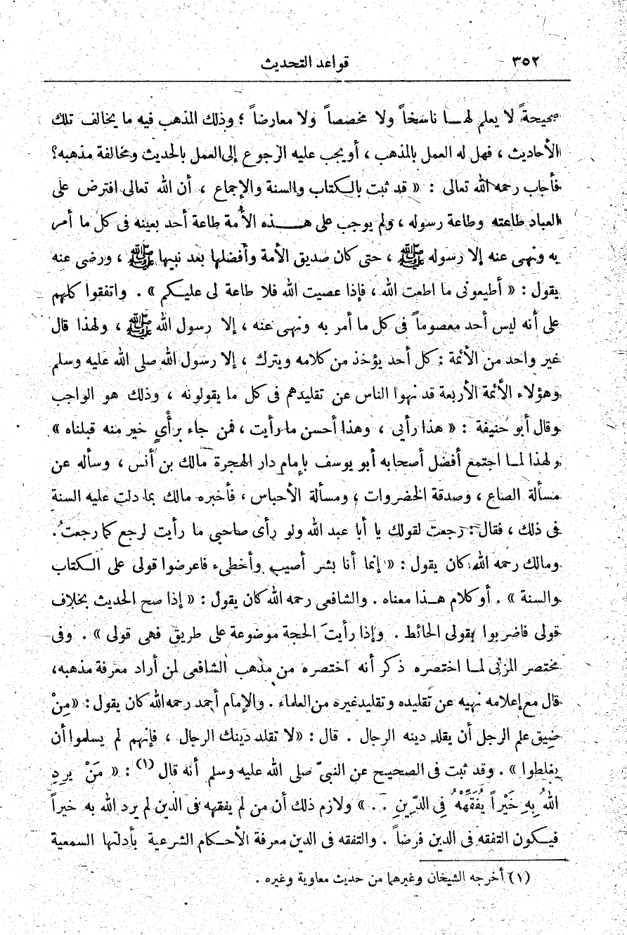 ومالك رحمه الله كان يقول: "إنما أنا بشر أصيب وأخطئ فاعرضوا قولي على الكتاب والسنة". أو كلام هذا معناه. والشافعي رحمه الله كان يقول: "إذا صح الحديث بخلاف قولي فاضربوا بقولي الحائط. وإذا رأيت الحجة موضوعة على طريق فهي قولي. وفي قال مع إعلامه نهيه عن تقليده وتقليد غيره من العلماء. والإمام أحمد رحمه الله كان يقول: "من ضيق علم الرجل أن يقلد دينه الرجال. قال: "لا تقلد دينك الرجال، فإنهم لم يسلموا أن يغلطوا". وقد ثبت في الصحيح عن النبي -صلى الله عليه وسلم- أنه قال1: "من يرد الله به خيرًا يفقهه في الدين ... " ولازم ذلك أن من لم يفقه في الدين لم يرد الله به خيرًا فيكون التفقه في الدين فرضًا. والتفقه في الدين معرفة الأحكام الشرعية بأدلتها السمعية