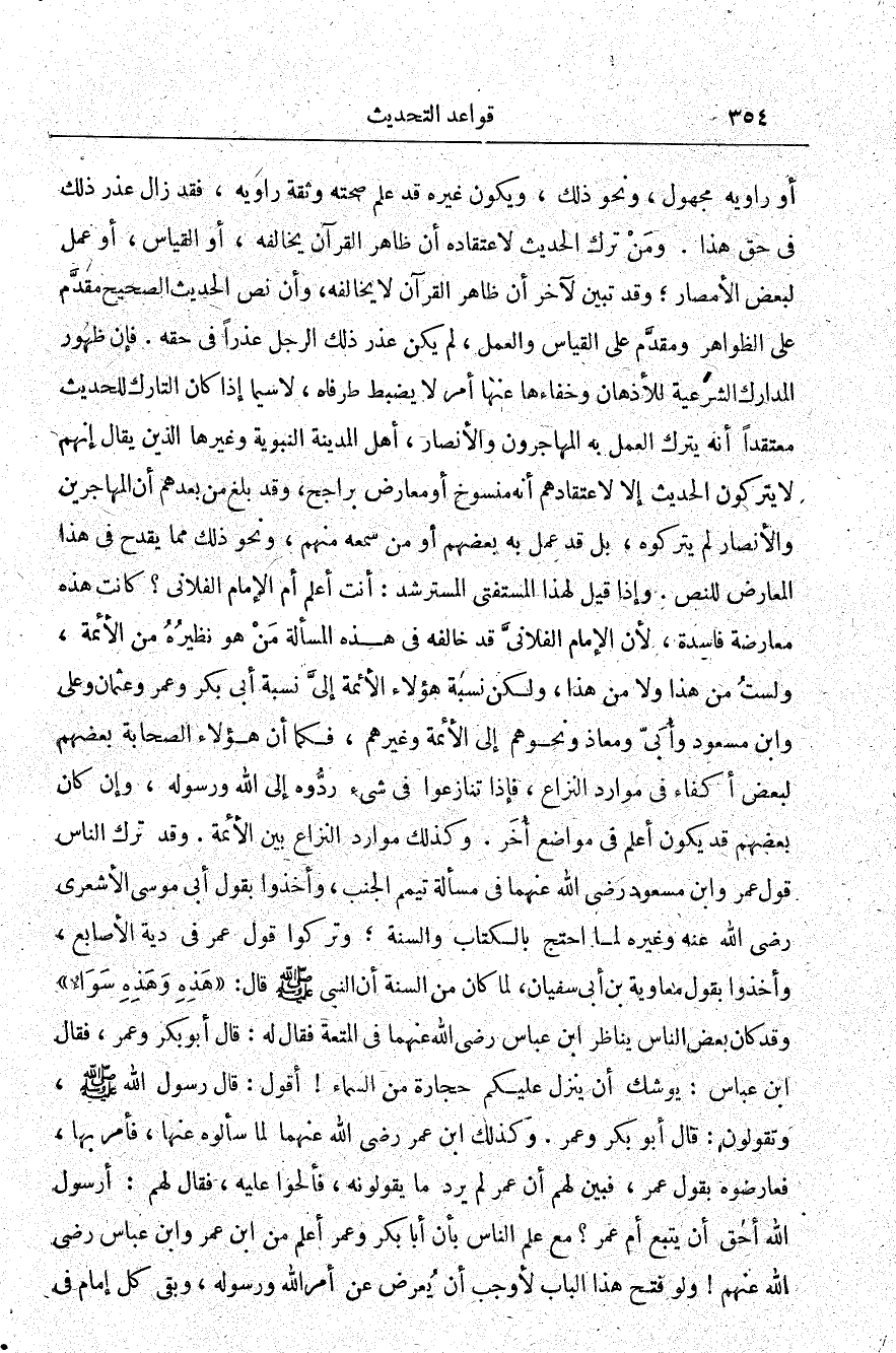 أو راويه مجهول، ونحو ذلك ويكون غيره قد علم صحته وثقة راويه فقد زال عذر ذلك في حق هذا، ومن ترك الحديث لاعتقاده أن ظاهر القرآن يخالفه، أو القياس أو عمل لبعض الأمصار وقد تبين لآخر أن ظاهر القرآن لا يخالفه، وأن نص الحديث الصحيح مقدم على الظواهر ومقدم على القياس، والعمل لم يكن عذر ذلك الرجل عذرًا في حقه فإن ظهور المدارك الشرعية للأذهان، وخفاءها عنها أمر لا يضبط طرفاه لا سيما إذا كان التارك للحديث معتقدًا أنه يترك العمل به المهاجرون والأنصار أهل المدينة النبوية، وغيرها الذين يقال إنهم لا يتركون الحديث إلا لاعتقادهم أنه منسوخ، أو معارض براجح وقد بلغ من بعدهم أن المهاجرين والأنصار لم يتركوه بل قد عمل به بعضهم أو من سمعه منهم، ونحو ذلك مما يقدح في هذا المعارض للنص، وإذا قيل لهذا المستفتي المسترشد أنت أعلم أم الإمام الفلاني كانت هذه معارضه فاسدة لأن الإمام الفلاني قد خالفه في هذه المسألة من هو نظير من الأئمة، ولست من هذا ولا من هذا ولكن نسبة هؤلاء الأئمة إلى نسبة أبي بكر وعمر وعثمان وعلي وابن مسعود وأبي ومعاذ ونحوهم إلى الأئمة وغيرهم، فكما أن هؤلاء الصحابة بعضهم لبعض أكفاء في موارد النزاع فإذا تنازعوا في شيء ردوه إلى الله ورسوله، وإن كان بعضهم قد يكون أعلم في مواضع أخر، وكذلك موارد النزاع بين الأئمة، وقد ترك الناس قول عمر وابن مسعود -رضي الله عنهما- في مسألة تيمم الجنب وأخذوا بقول أبي موسى الأشعري -رضي الله عنه- وغيره لما احتج بالكتاب والسنة، وتركوا قول عمر في دية الأصابع، وأخذوا بقول معاوية بن أبي سفيان لما كان من السنة أن النبي -صلى الله عليه وسلم- قال: "هذه وهذه سواء" وقد كان بعض الناس يناظر ابن عباس -رضي الله عنهما- في المتعة فقال له قال أبو بكر وعمر فقال ابن عباس يوشك أن ينزل عليكم حجارة من السماء أقول قال رسول الله -صلى الله عليه وسلم- وتقولون قال أبو بكر وعمر، وكذلك ابن عمر -رضي الله عنهما- لما سألوه عنها فأمر بها فعارضوه بقول عمر فبين لهم أن عمر لم يرد ما يقولونه فألحوا عليه فقال لهم أرسول الله -صلى الله عليه وسلم- أحق أن يتبع أم عمر؟ مع علم الناس بأن أبا بكر وعمر أعلم من ابن عمر وابن عباس -رضي الله عنهم- ولو فتح هذا الباب لأوجب أن يعرض عن أمر الله ورسوله، وبقي كل إمام في أتباعه بمنزلة النبي -صلى الله عليه وسلم- في أمته. وهذا تبديل للدين وشبيه بما عاب الله به النصارى في قوله: {اتَّخَذُوا أَحْبَارَهُمْ وَرُهْبَانَهُمْ أَرْبَابًا مِنْ دُونِ اللَّهِ وَالْمَسِيحَ ابْنَ مَرْيَمَ وَمَا أُمِرُوا إِلَّا لِيَعْبُدُوا إِلَهًا وَاحِدًا لا إِلَهَ إِلَّا هُوَ سُبْحَانَهُ عَمَّا يُشْرِكُونَ} 1 والله سبحانه أعلم". ا. هـ. كلام الإمام تقي الدين قدس سره.