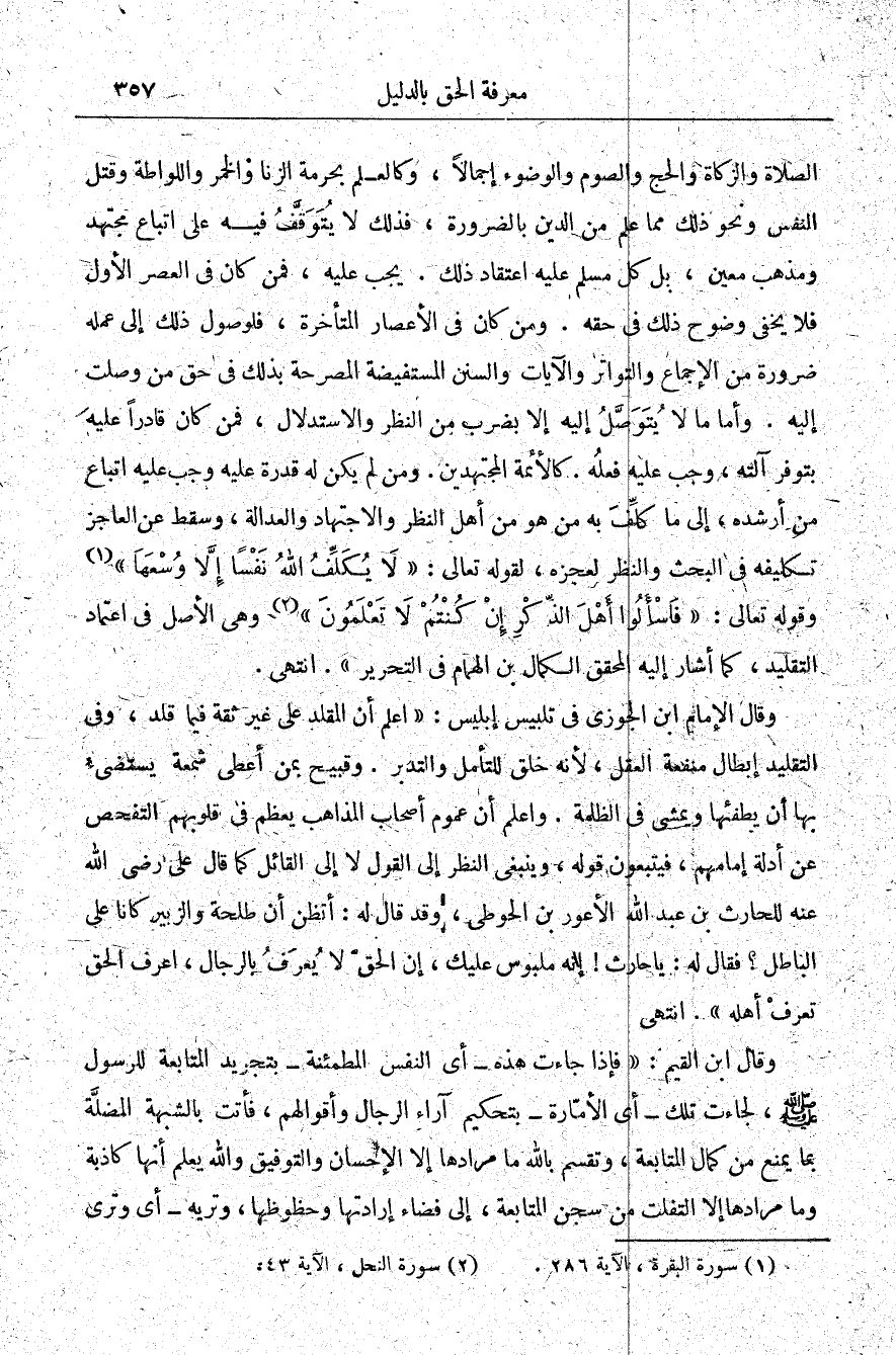 وقال الإمام ابن الجوزي في تلبيس إبليس: "اعلم أن المقلد على غير ثقة فيما قلد، وفي التقليد إبطال منفعة العقل لأنه خلق للتأمل والتدبر وقبيح بمن أعطى شمعة يستضيء بها أن يطفئها، ويمشي في الظلمة واعلم أن عموم أصحاب المذاهب يعظم في قلوبهم التفحص عن أدلة إمامهم فيتبعون قوله وينبغي النظر إلى القول لا إلى القائل كما قال علي -رضي الله عنه- للحارث بن عبد الله الأعور بن الحوطي وقد قال له أتظن أن طلحة، والزبير كانا على الباطل فقال له: يا حارث إنه ملبوس عليك إن الحق لا يعرف بالرجال اعرف الحق تعرف أهله". ا. هـ.