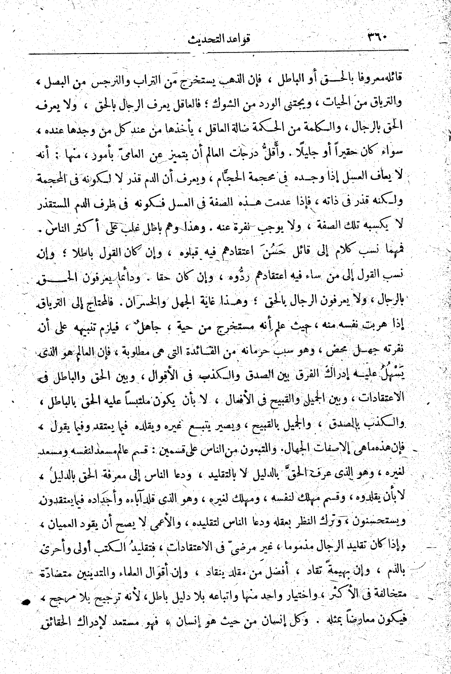 قائله معروفا بالحق أو الباطل، فإن الذهب يستخرج من التراب والنرجس من البصل، والترياق من الحيات ويجتني الورد من الشوك فالعاقل يعرف الرجال بالحق ولا يعرف الحق بالرجال والكلمة من الحكمة ضالة العاقل يأخذها من عند كل من وجدها عنده سواء كان حقيرًا أو جليلًا وأقل درجات العالم أن يتميز عن العامي بأمور منها أنه لا يعاف العسل إذا وجده في محجمة الحجام، ويعرف أن الدم قذر لا لكونه في المحجمة، ولكنه قذر في ذاته فإذا عدمت هذه الصفة في العسل فكونه في ظرف الدم المستقذر لا يكسبه تلك الصفة ولا يوجب نفرة عنه، وهذا وهم باطل غلب على أكثر الناس فمهما نسب كلام إلى قائل حسن اعتقادهم فيه قبلوه، وإن كان القول باطلا وإن نسب القول إلى من ساء فيه اعتقادهم ردوه، وإن كان حقا ودائما يعرفون الحق بالرجال، ولا يعرفون الرجال بالحق، وهذا غاية الجهل والخسران فالمحتاج إلى الترياق إذا هربت نفسه منه حيث علم أنه مستخرج من حية جاهل فيلزم تنبيهه على أن نفرته جهل محض وهو سبب حرمانه من الفائدة التي هي مطلوبة فإن العالم هو الذي يسهل عليه إدراك الفرق بين الصدق والكذب في الأقوال وبين الحق والباطل في الاعتقادات، وبين الجميل والقبيح في الأفعال لا بأن يكون ملتبسًا عليه الحق بالباطل والكذب بالصدق والجميل بالقبيح ويصير يتبع غيره ويقلده فيما يعتقد، وفيما يقول فإن هذه ما هي إلا صفات الجهال والمتبعون من الناس على قسمين قسم عالم مسعد لنفسه ومسعد لغيره، وهو الذي عرف الحق بالدليل لا بالتقليد ودعا الناس إلى معرفة الحق بالدليل لا بأن يقلدوه، وقسم لنفسه ومهلك لغيره وهو الذي قلد آباءه وأجداده فيما يعتقدون ويستحسنون، وترك النظر بعقله ودعا الناس لتقليده، والأعمى لا يصح أن يقود العميان وإذا كان تقليد الرجال مذموما غير مرضي في الاعتقادات فتقليد الكتب أولى وأخرى بالذم، وإن بهيمة تقاد أفضل من مقلد ينقاد، وإن أقوال العلماء والمتدينين متضادة متخالفة في الأكثر، واختيار واحد منها واتباعه بلا دليل باطل لأنه ترجيح بلا مرجح فيكون معارضًا بمثله، وكل إنسان من حيث هو إنسان فهو مستعد لإدراك الحقائق