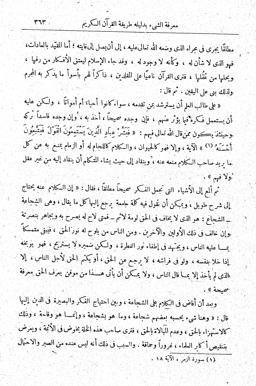 "على طالب العلم أن يسترشد بم تقدمه، سواء كانوا أحياء أم أمواتًا، ولكن عليه أن يستعمل فكره فيما يؤثر عنهم، فإن وجده صحيحًا أخذ به وإن وجده فاسدًا تركه، وحينئذ يكون ممن قال الله تعالى فيهم: {فَبَشِّرْ عِبَادِ، الَّذِينَ يَسْتَمِعُونَ الْقَوْلَ فَيَتَّبِعُونَ أَحْسَنَهُ} 1 الآية، وإلا فهو كالحيوان، والكلام كاللحام له أو الزمام يمنع به عن كل ما يريد صاحب الكلام منعه عنه، وينقاد إلى حيث يشاء المتكلم أن ينقاد إليه من غير عقل ولا فهم".