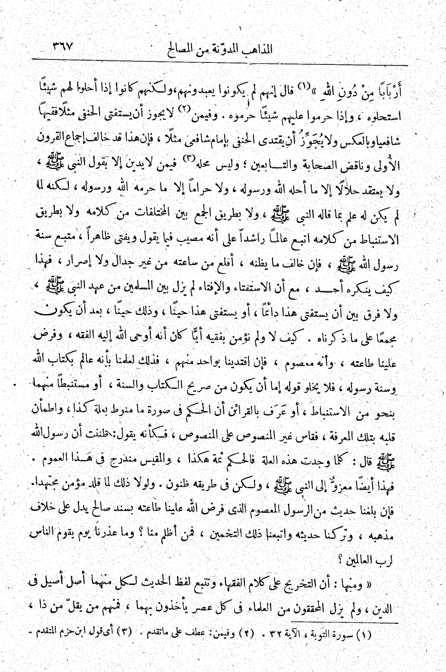 أَرْبَابًا مِنْ دُونِ اللَّهِ} 1 قال إنهم لم يكونوا يعبدونهم، ولكنهم كانوا إذا أحلوا لهم شيئًا استحلوه، وإذا حرموا عليهم شيئًا حرموه، وفيمن2 لا يجوز أن يستفتي الحنفي مثلًا فقيهًا شافعيًّا وبالعكس ولا يُجوز أن يقتدى الحنفي بإمام شافعي مثلًا، فإن هذا قد خالف إجماع القرون الأولى وناقض الصحابة والتابعين وليس محله3 فيمن لا يدين إلا بقول النبي -صلى الله عليه وسلم- ولا يعتقد حلالًا إلا ما أحله الله ورسوله ولا حرامًا إلا ما حرمه الله ورسوله، لكنه لما لم يكن له علم بما قاله النبي -صلى الله عليه وسلم- ولا بطريق الجمع بين المختلفات من كلامه ولا بطريق الاستنباط من كلامه اتبع عالمًا راشدًا على أنه مصيب فيما يقول ويفتي ظاهرًا متبع سنة رسول الله -صلى الله عليه وسلم، فإن خالف ما يظنه أقلع من ساعته من غير جدال ولا إصرار، فهذا كيف ينكره أحد مع أن الاستفتاء والإفتاء لم يزل بين المسلمين من عهد النبي -صلى الله عليه وسلم- ولا فرق بين أن يُستفتى هذا دائمًا أو يُستفتى هذا حينًا، وذلك حينًا بعد أن يكون مجمعًا على ما ذكرناه كيف لا، ولم نؤمن بفقيه أيًّا كان أنه أوحى الله إليه الفقه، وفرض علينا طاعته وأنه معصوم فإن اقتدينا بواحد منهم فذلك لعلمنا بأنه عالم بكتاب الله وسنة رسوله فلا يخلو قوله إما أن يكون من صريح الكتاب والسنة أو مستنبطًا منهما بنحو من الاستنباط، أو عرف بالقرائن أن الحكم في صورة ما منوط بعلة كذا، وأطمان قلبه بتلك المعرفة فقاس غير المنصوص على المنصوص فكأنه يقول: ظننت أن رسول الله -صلى الله عليه وسلم- قال: كلما وجدت هذه العلة فالحكم في طريقة ظنون، ولولا ذلك لما قلد مؤمن مجتهدًا فإن بلغنا حديث من الرسول المعصوم الذي فرض الله علينا طاعته بسند صالح يدل على خلاف مذهبه، وتركنا حديثه واتبعنا ذلك التخمين فمن أظلم منا؟ وما عذرنا يوم يقوم الناس لرب العالمين؟.
