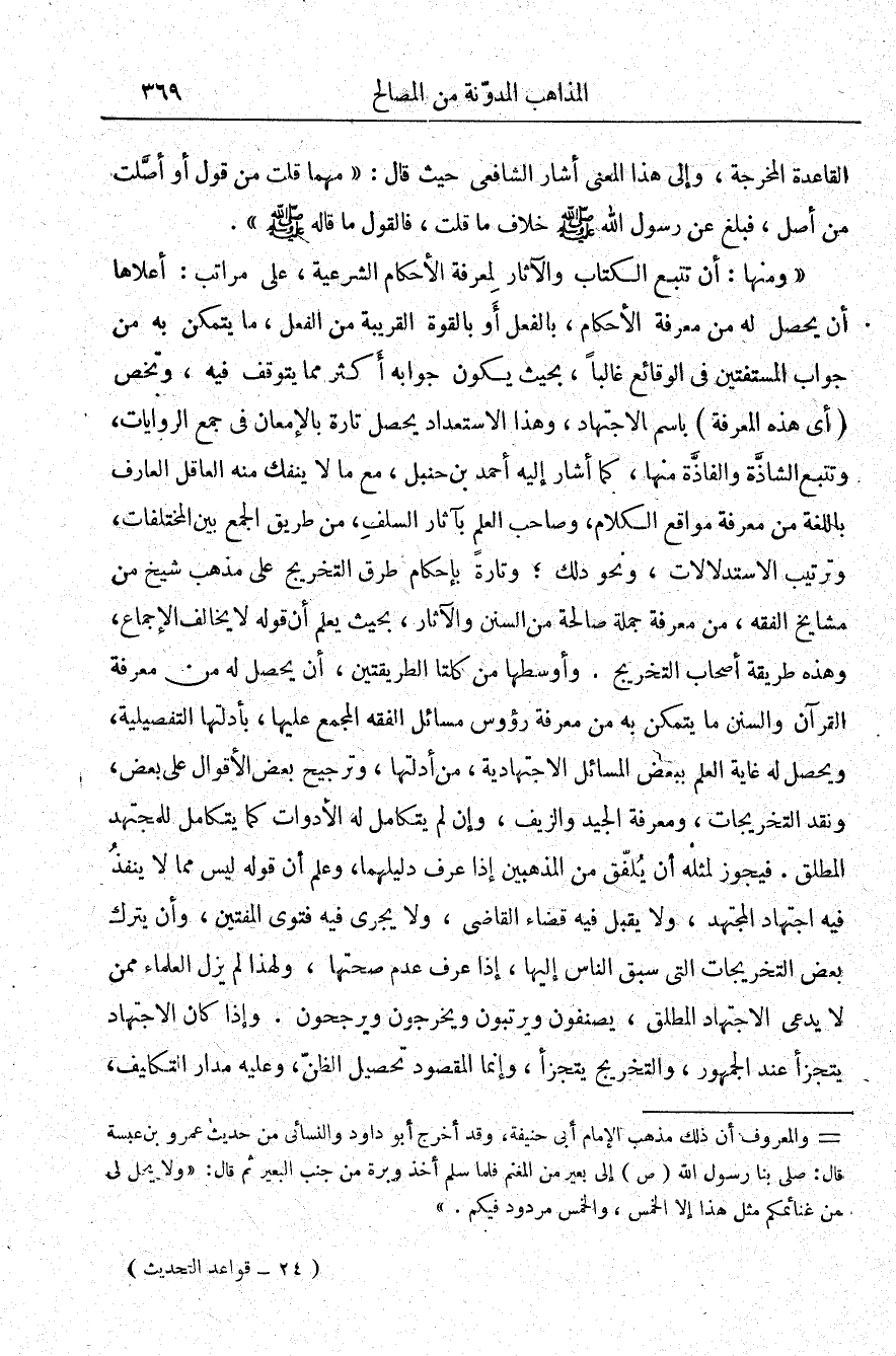 "ومنها: أن تتبع الكتاب والآثار لمعرفة الأحكام الشرعية على مراتب أعلاها أن يحصل له من معرفة الأحكام بالفعل أو بالقوة القريبة من الفعل ما يتمكن به من جواب المستفتين في الوقائع غالبًا بحيث يكون جوابه أكثر مما يتوقف فيه، وتخص "أي هذه المعرفة" باسم الاجتهاد، وهذا الاستعداد يحصل تارة بالإمعان في جمع الروايات وتتبع الشاذة والفاذة منها، كما أشار إليه أحمد بن حنبل مع ما لا ينفك منه العاقل العارف باللغة من معرفة مواقع الكلام، وصاحب العلم بآثار السلف من طريق الجمع بين المختلفات، وترتيب الاستدلالات ونحو ذلك، وتارة بإحكام طرق التخريج على مذهب شيخ من مشايخ الفقه من معرفة جملة صالحة من السنن والآثار بحيث يعلم أن قوله لا يخالف الإجماع القرآن والسنن ما يتمكن به من معرفة رءوس مسائل الفقه المجمع عليها بأدلتها التفصيلية، ويحصل له غاية العلم ببعض المسائل الاجتهادية من أدلتها، وترجيح بعض الأقوال على بعض، ونقد التخريجات، ومعرفة الجيد والزيف، وإن لم يتكامل له الأدوات كما يتكامل للمجتهد المطلق فيجوز لمثله أن يلفق من المذهبين إذا عرف دليلهما، وعلم أن قوله ليس مما لا ينفذ فيه اجتهاد المجتهد، ولا يقبل فيه قضاء القاضي ولا يجري فيه فتوى المفتين، وأن يترك بعض التخريجات التي سبق الناس إليها إذا عرف عدم صحتها، ولهذا لم يزل العلماء ممن لا يدعي الاجتهاد المطلق يصنفون ويرتبون ويخرجون ويرجحون، وإذا كان الاجتهاد يتجزأ عند الجمهور والتخريج يتجزأ، وإنما المقصود تحصيل الظن وعليه مدار التكليف،