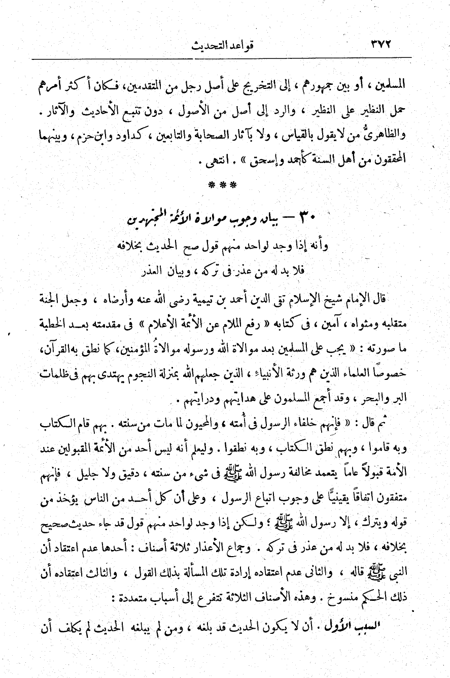3- بيان وجوب موالاة الأئمة المجتهدين وأنه إذا وجد لواحد منهم قول صح الحديث بخلافة فلا بد له من عذر في تركة وبيان العذر: