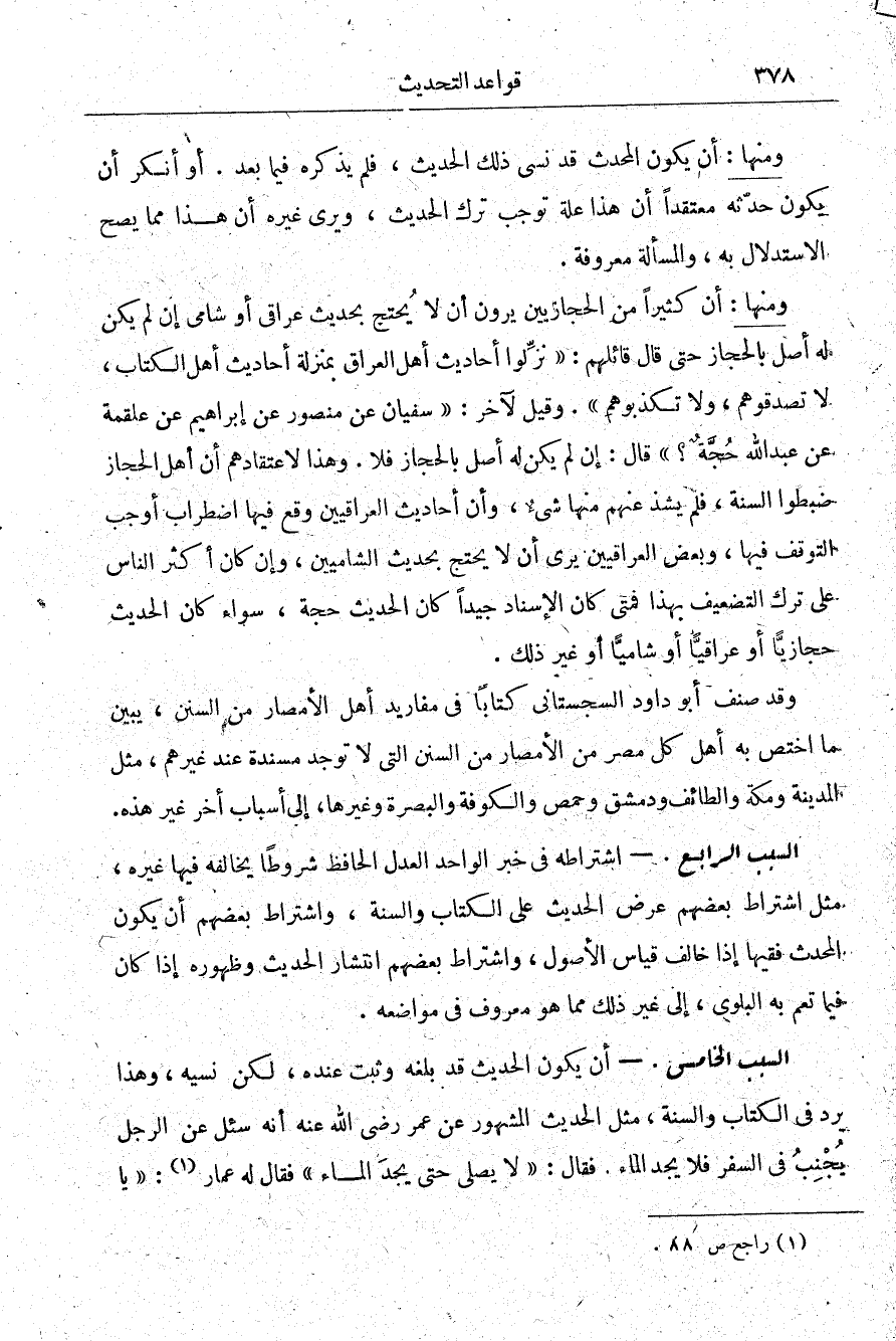 ومنها: أن كثيرًا من الحجازيين يرون أن لا يحتج بحديث عراقي أو شامي إن لم يكن له أصل بالحجاز حتى قال قائلهم: "نزلوا أحاديث أهل العراق بمنزلة أحاديث أهل الكتاب، لا تصدقوهم، ولا تكذبوهم". وقيل لآخر: "سفيان عن منصور عن إبراهيم عن علقمة عن عبد الله حجة؟ " قال: إن لم يكن له أصل بالحجاز فلا. وهذا لاعتقادهم أن أهل الحجاز ضبطوا السنة فلم يشذ عنهم منها شيء، وأن أحاديث العراقيين وقع فيها اضطراب أوجب التوقف فيها، وبعض العراقيين يرى أن لا يحتج بحديث الشاميين، وإن كان أكثر الناس على ترك التضعيف بهذا فمتى كان الإسناد جيدًا كان الحديث حجة سواء كان الحديث حجازيًّا أو عراقيًّا أو شاميًّا أو غير ذلك.
