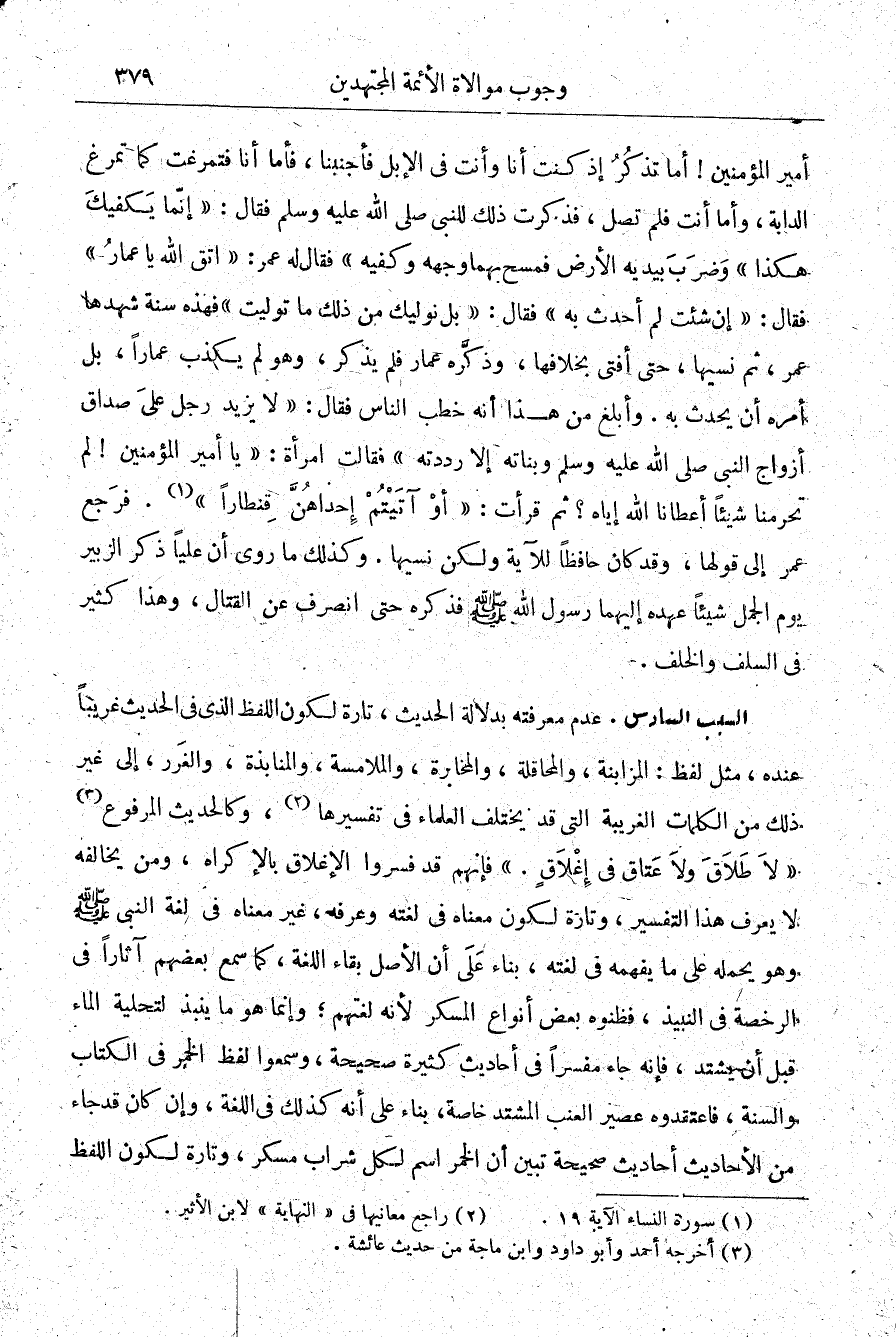 أمير المؤمنين أما تذكر إذ كنت أنا وأنت في الإبل فاجتنبنا، فأما أنا فتمرغت كما تمرغ الدابة، وأما أنت فلم تصل، فذكرت ذلك للنبي -صلى الله عليه وسلم- فقال: "إنما يكفيك هكذا" وضرب بيديه الأرض فمسح بها وجهه وكفيه. فقال له عمر: "اتق الله يا عمار" فقال: "إن شئت لم أحدث به" فقال: "بل نوليك من ذلك ما توليت" فهذه سنة شهدها عمر، ثم نسيها، حتى أفتى بخلافها، وذكره عمار فلم يذكر، وهو لم يكذب عمارًا، بل أمره أن يحدث به. وأبلغ من هذا أنه خطب الناس فقال: "لا يزيد رجل على صداق أزواج النبي -صلى الله عليه وسلم- وبناته إلا رددته" فقالت امرأة: "يا أمير المؤمنين! بل تحرمنا شيئًا أعطانا الله إياه؟ ثم قرأت: {وَآتَيْتُمْ إِحْدَاهُنَّ قِنْطَارًا} 1. فرجع عمر إلى قولها، وقد كان حافظًا للآية ولكن نسيها. وكذلك ما روي عن عليًّا ذكر الزبير يوم الجمل شيئًا عهده إليهما رسول الله -صلى الله عليه وسلم- فذكره حتى انصرف عن القتال، وهذا كثير في السلف والخلف.