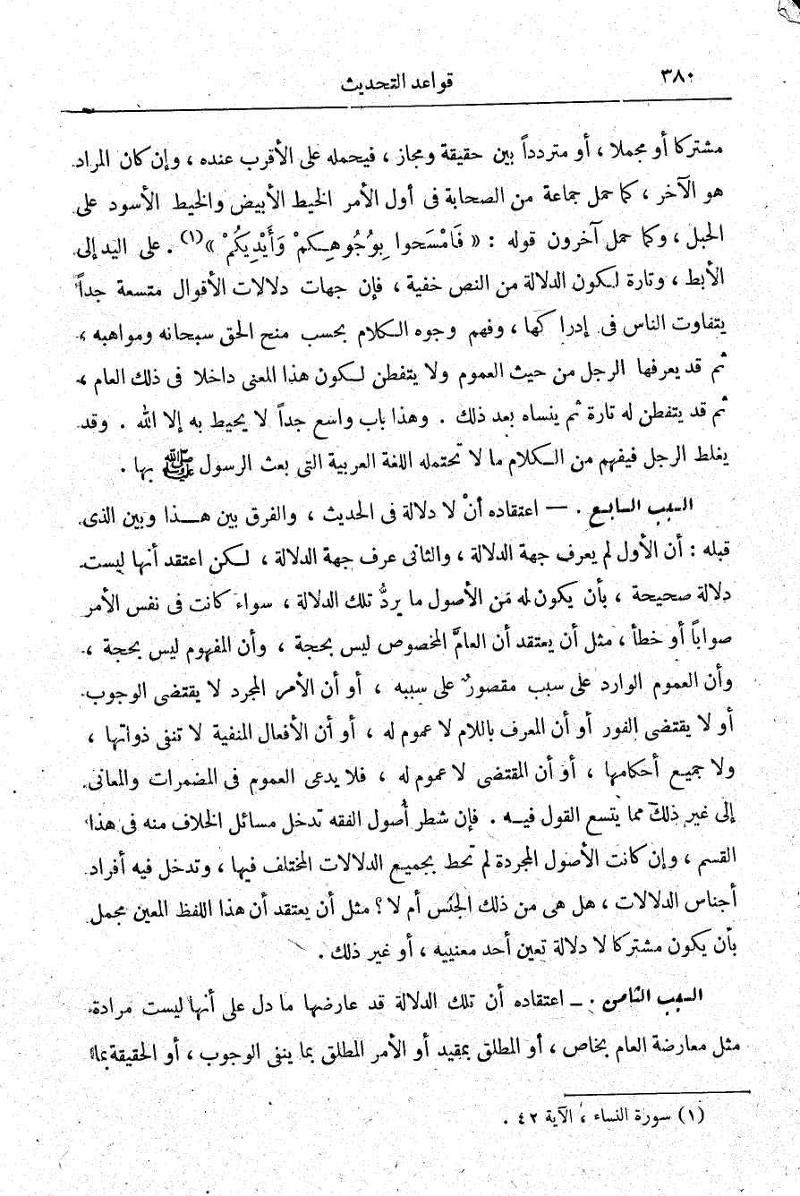 اعتقاده أن لا دلالة في الحديث، والفرق بين هذا وبين الذي قبله: أن الأول لم يعرف جهة الدلالة والثاني عرف جهة الدلالة، لكن اعتقد أنها ليست دلالة صحيحة بأن يكون له من الأصول ما يرد تلك الدلالة سواء كانت في نفس الأمر صوابًا أو خطأ مثل أن يعتقد أن العام المخصوص ليس بحجة وأن المفهوم ليس بحجة وأن العموم الوارد على سبب مقصور على سببه أو أن الأمر المجرد لا يقتضى الوجوب أو لا يقتضي الفور أو أن المعرف باللام لا عموم له، أو أن الأفعال المنفية لا تنفي ذواتها ولا جميع أحكامها، أو أن المتقضى لا عموم له فلا يدعى العموم في المضمرات والمعاني إلى غير ذلك مما يتسع القول فيه فإن شطر أصول الفقه تدخل مسائل الخلاف منه في هذا القسم، وإن كانت الأصول المجردة لم تحط بجميع الدلالات المختلف فيها، وتدخل فيه أفراد أجناس الدلالات هل هي من ذلك الجنس أم لا مثل أن يعتقد أن هذا اللفظ المعين مجمل بأن يكون مشتركًا دلالة تعين أحد معنييه أو غير ذلك.