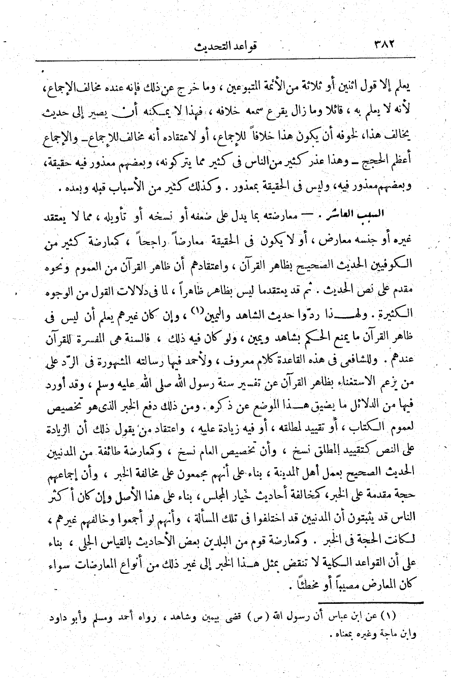 يعلم إلا قول اثنين أو ثلاثة من الأئمة المتبوعين، وما خرج عن ذلك فإنه عنده مخالف الإجماع؛ لأنه لا يعلم به قائلا وما زال يقرع سمعه خلافه، فهذا لا يمكنه أن يصير إلى حديث يخالف هذا لخوفه أن يكون هذا خلافًا للإجماع أو لاعتقاده أنه مخالف للإجماع -والإجماع أعظم الحجج- وهذا عذر كثير من الناس في كثير مما يتركونه، وبعضهم معذور فيه حقيقة وبعضهم معذور فيه، وليس في الحقيقة بمعذور وكذلك كثير من الأسباب قبله وبعده.