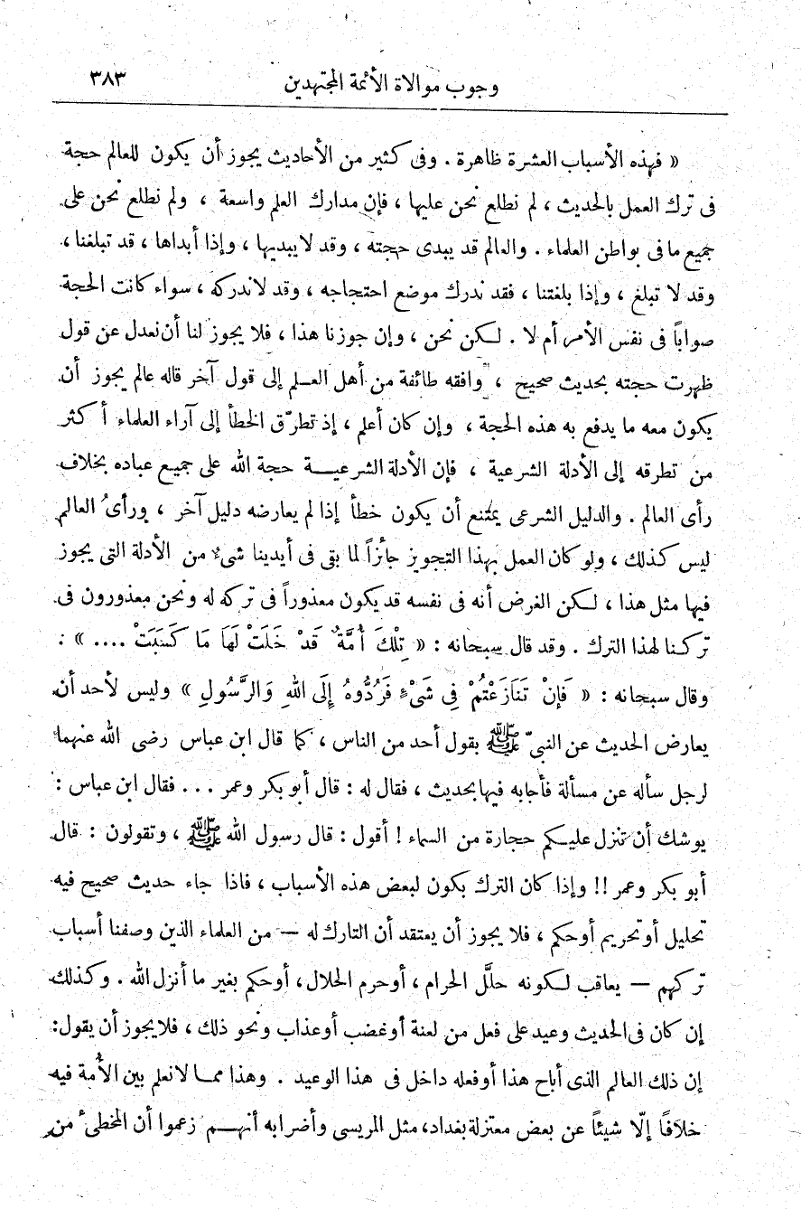 "فهذه الأسباب العشرة ظاهرة. وفي كثير من الأحاديث يجوز أن يكون للعالم حجة في ترك العمل بالحديث، لم نطلع نحن عليها فإن مدارك العلم، واسعة ولم نطلع نحن على جميع ما في بواطن العلماء، والعالم قد يبدي حجته وقد لا يبديها وإذا أبداها قد تبلغنا وقد لا تبلغ، وإذا بلغتنا فقد ندرك موضع احتجاجه وقد لا ندركه سواء كانت الحجة صوابًا في نفس الأمر أم لا، لكن نحن وإن جوزنا هذا فلا يجوز لنا أن نعدل عن قول ظهرت حجته بحديث صحيح وافقه طائفة من أهل العلم إلى قول آخر قاله عالم يجوز أن يكون معه ما يدفع به هذه الحجة، وإن كان أعلم إذ تطرق الخطأ إلى آراء العلماء أكثر من تطرقه إلى الأدلة الشرعي فإن الأدلة الشرعية حجة الله على جميع عباده بخلاف رأي العالم، والدليل الشرعي يمتنع أن يكون خطأ إذا لم يعارضه دليل آخر ورأي العالم ليس كذلك، ولو كان العمل بهذا التجويز جائزًا لما بقي في أيدينا شيء من الأدلة التي يجوز فيها مثل هذا لكن الغرض أنه في نفسه قد يكون معذورًا في تركه له، ونحن معذورون في تركنا لهذا الترك وقد قال سبحانه: {تِلْكَ أُمَّةٌ قَدْ خَلَتْ لَهَا مَا كَسَبَت} .