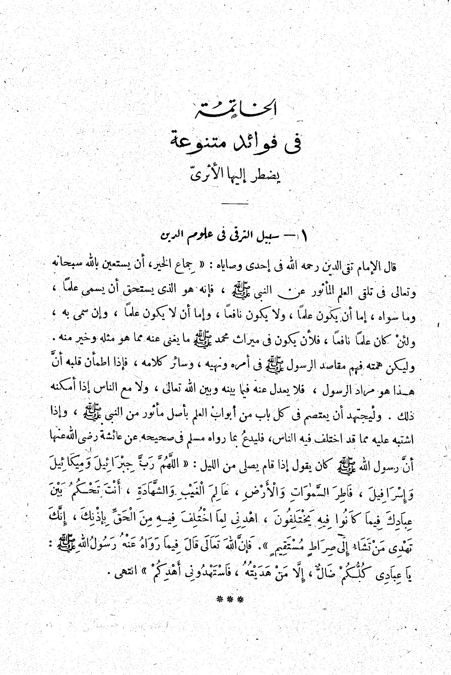 قال الإمام تقي الدين رحمه الله في إحدى وصاياه: "جماع الخير أن يستعين بالله سبحانه وتعالى في تلقي العلم المأثور عن النبي -صلى الله عليه وسلم- فإنه الذي يستحق أن يسمى علمًا، وما سواه إما أن يكون علمًا ولا يكون نافعًا، وإما أن لا يكون علمًا وإن سُمي به، ولئن كان علمًا نافعًا فلأن يكون في ميراث محمد ما يغني عنه مما هو مثله وخير منه، وليكن همته فهم مقاصد الرسول في أمره ونهيه وسائر كلامه، فإذا اطمأن قلبه أن هذا هو مراد الرسول فلا يعدل عنه فيما بينه وبين الله تعالى ولا مع الناس إذا أمكنه ذلك، وليجهد أن يعتصم في كل باب من أبواب العلم بأصل مأثور من النبي -صلى الله عليه وسلم- وإذا اشبته عليه مما قد اختلف في الناس فليدع بما رواه مسلم في صحيحه عن عائشة -رضي الله عنها- أن رسول الله -صلى الله عليه وسلم- كان يقول إذا قام يصلي من الليل: "الله رب جبرائيل وميكائيل وإسرافيل فاطر السموات، والأرض عالم الغيث والشهادة أنت تحكم بين عبادك فيما كانوا فيه يختلفون اهدني لما اختلف فيه من الحق بإذنك إنك تهدي من تشاء إلى صراط مستقيم" فإن الله تعالى قال فيما رواه عنه رسول الله -صلى الله عليه وسلم: "يا عبادي كلكم ضال إلا من هديته فاستهدوني أهدكم". ا. هـ.