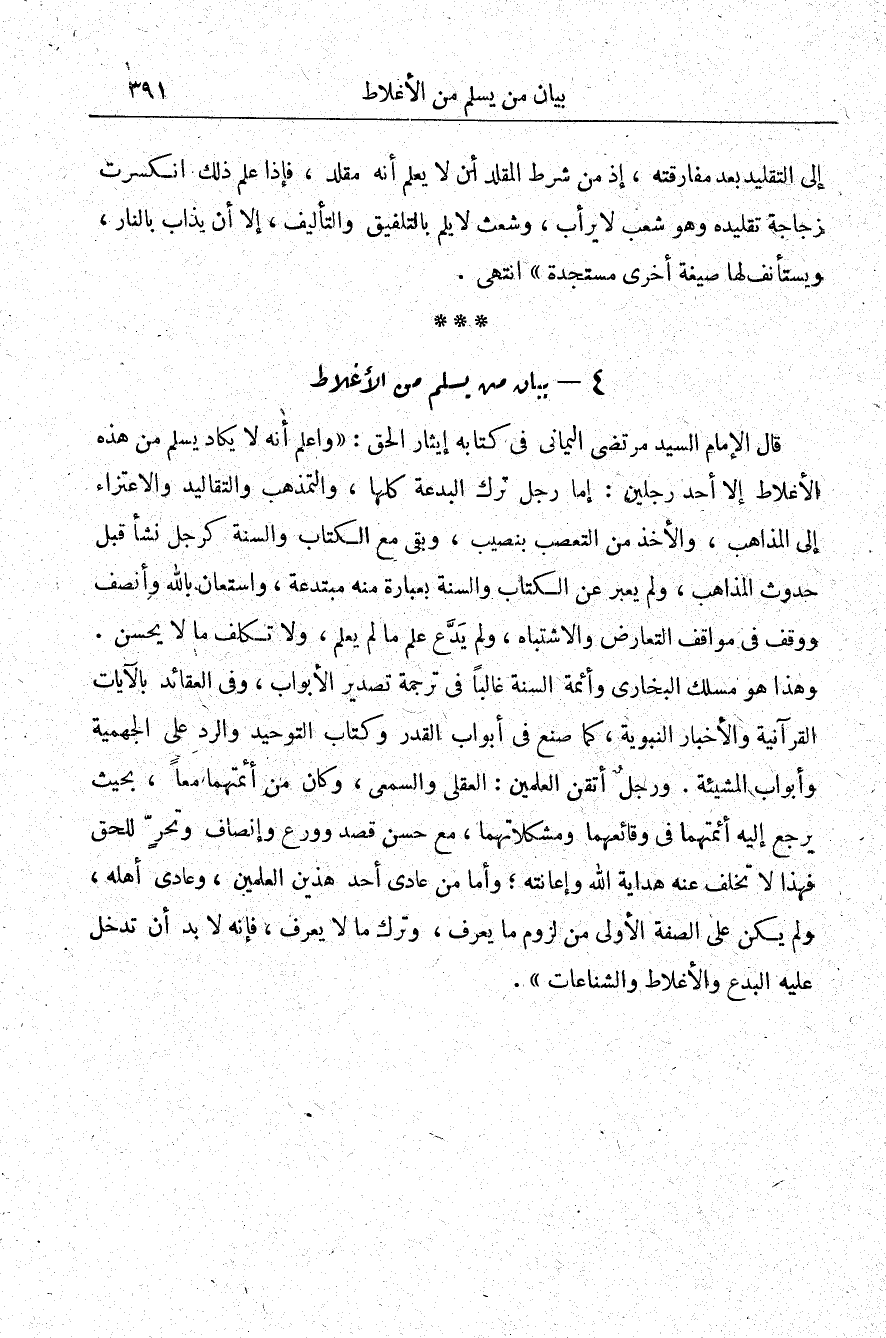 قال الإمام السيد مرتضى اليماني في كتابه إيثار الحق: "واعلم أنه لا يكاد يسلم من هذه الأغلاط إلا أحد رجلين؛ إما رجل ترك البدعة كلها، والتمذهب والتقاليد والاعتزاء إلى المذاهب والأخذ من التعصب بنصيب، وبقي مع الكتاب والسنة كرجل نشأ قبل حدوث المذاهب، ولم يعبر عن الكتاب والسنة بعبارة منه مبتدعة، واستعان بالله وأنصف ووقف في مواقف التعارض والاشتباه، ولم يدع علم ما لم يعلم، ولا تكلف ما لا يحسن، وهذا هو مسلك البخاري، وأئمة السنة غالبًا في ترجمة تصدير الأبواب، وفي العقائد بالآيات القرآنية والأخبار النبوية، كما صنع في أبواب القدر وكتاب التوحيد والرد على الجهمية وأبواب المشيئة، ورجل أتقن العلمين: العقلي والسمعي، وكان من أئمتهما معًا بحيث يرجع إليه أئمتهما في وقائعهما ومشكلاتهما مع حسن قصد وورع وإنصاف وتحر للحق فهذا لا تخلف عنه هداية الله وإعانته، وأما من عادى أحد هذين العلمين، وعادى أهله ولم يكن على الصفة الأولى من لزوم ما يعرف وترك ما لا يعرف، فإنه لا بد أن تدخل عليه البدع والأغلاط والشناعات"