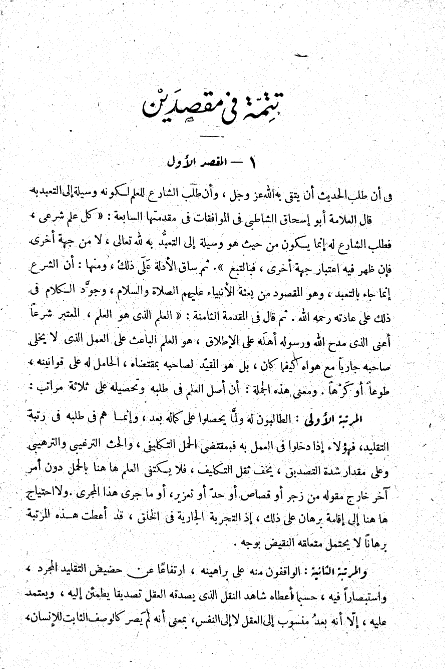 قال العلامة أبو إسحاق الشاطبي في الموافقات في مقدمتها السابعة: "كل علم شرعي، فطلب الشارع له إنما يكون من حيث هو وسيلة إلى التعبد به لله تعالى، لا من جهة أخرى فإن ظهر فيه اعتبار جهة أخرى فبالتبع". ثم ساق الأدلة على ذلك، ومنها أن الشرع إنما جاء بالتعبد وهو المقصود من بعثة الأنبياء عليهم الصلاة والسلام، وجود الكلام في ذلك على عادته رحمه الله ثم قال في المقدمة الثامنة: "العلم الذي هو العلم المعتبر شرعًا أعني الذي مدح الله ورسوله أهله على الإطلاق هو العلم الباعث على العمل الذي لا يخلي صاحبه جاريًا مع هواه كيفما كان، بل هو المقيد لصاحبه بمقتضاه الحامل له على قوانينه طوعًا أو كرهًا، ومعنى هذه الجملة أن أصل العلم في طلبه، وتحصيله على ثلاثة مراتب: