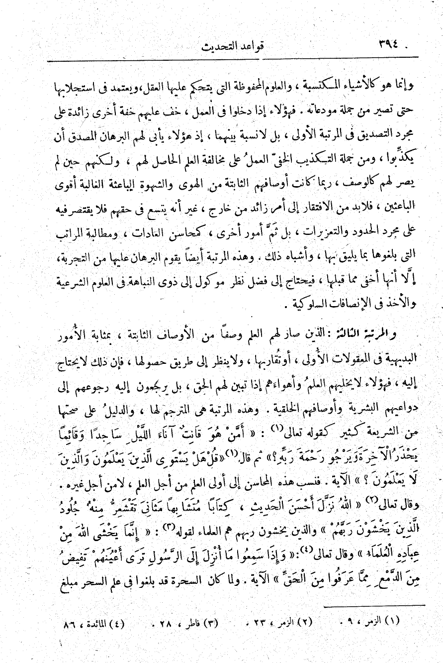 والمرتبة الثالثة: الذين صار لهم العلم وصفًا من الأوصاف الثابتة، بمثابة الأمور البديهية في المعقولات الأولى أو تقاربها، ولا ينظر إلى طريق حصولها، فإن ذلك لا يحتاج إليه، فهؤلاء لا يخليهم العلم وأهواءهم إذا تبين لهم الحق، بل يرجعون إليه رجوعهم إلى دواعيهم البشرية وأوصافهم الخلقية، وهذه المرتبة هي المترجم لها، والدليل على صحتها من الشريعة كثير كقوله تعالى1: {أَمْ مَنْ هُوَ قَانِتٌ آنَاءَ اللَّيْلِ سَاجِدًا وَقَائِمًا يَحْذَرُ الْآخِرَةَ وَيَرْجُو رَحْمَةَ رَبِّهِ} ثم قال1: {قُلْ هَلْ يَسْتَوِي الَّذِينَ يَعْلَمُونَ وَالَّذِينَ لَا يَعْلَمُون} الآية. فنسب هذه المحاسن إلى أولي العلم من أجل العلم لا من أجل غيره. وقال تعالى2: {اللَّهُ نَزَّلَ أَحْسَنَ الْحَدِيثِ كِتَابًا مُتَشَابِهًا مَثَانِيَ تَقْشَعِرُّ مِنْهُ جُلُودُ الَّذِينَ يَخْشَوْنَ رَبَّهُم} والذين يخشون ربهم هم العلماء لقوله3: {إِنَّمَا يَخْشَى اللَّهَ مِنْ عِبَادِهِ الْعُلَمَاءُ} وقال تعالى4: {وَإِذَا سَمِعُوا مَا أُنْزِلَ إِلَى الرَّسُولِ تَرَى أَعْيُنَهُمْ تَفِيضُ مِنَ الدَّمْعِ مِمَّا عَرَفُوا مِنَ الْحَقِّ} الآية. ولما كان السحرة قد بلغوا في علم السحر مبلغ
