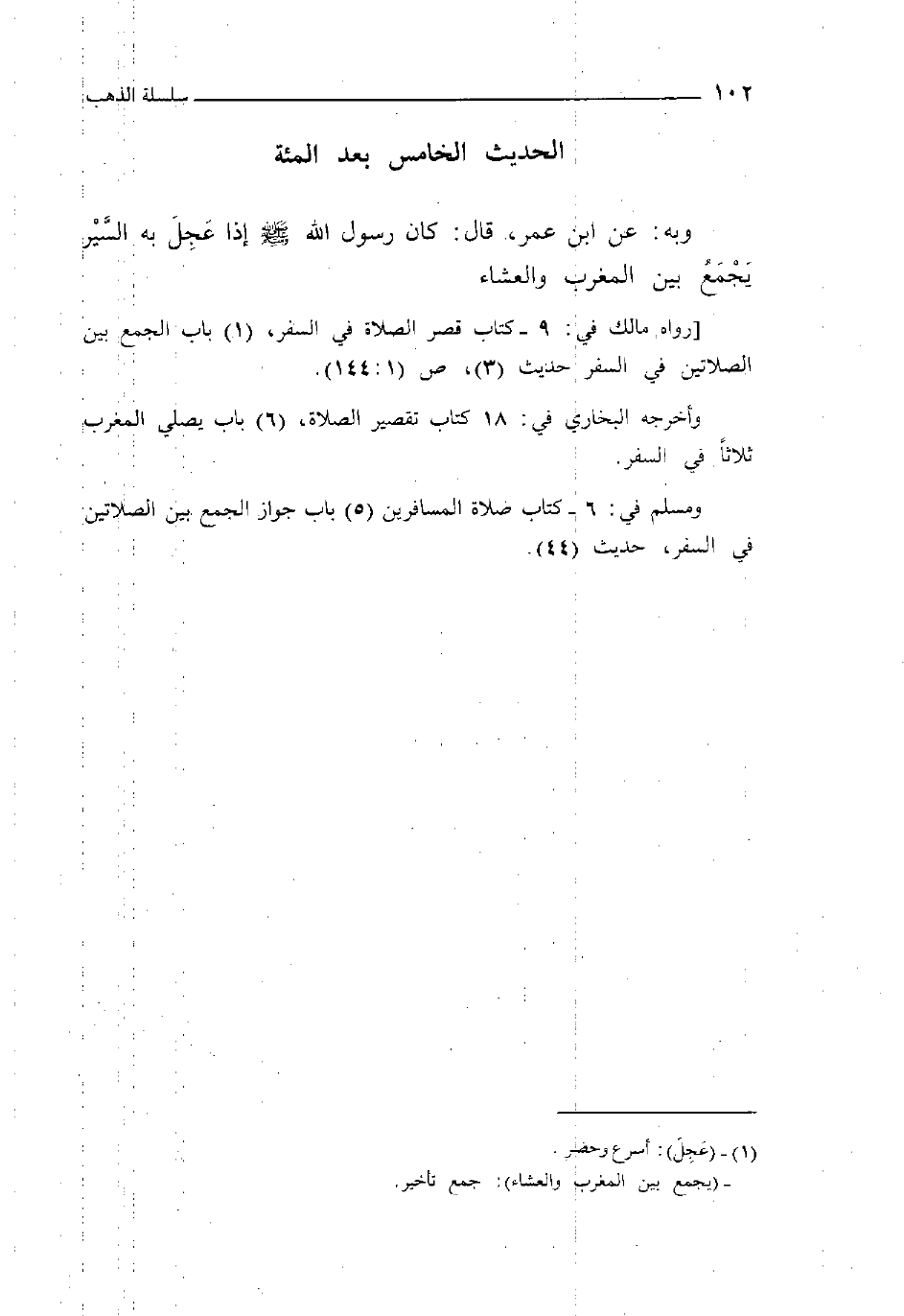 105 - وَبِه عَن ابْن عمر قَالَ كَانَ رَسُول الله صلى الله عَلَيْهِ وَسلم إِذا عجل بِهِ السّير يجمع بَين الْمغرب وَالْعشَاء