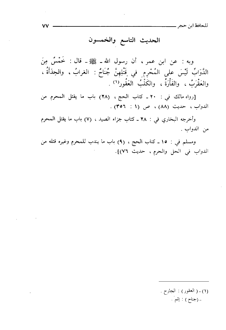 59 - وَبِه عَن ابْن عمر أَن رَسُول الله صلى الله عَلَيْهِ وَسلم قَالَ خمس من الدَّوَابّ لَيْسَ على الْمحرم فِي قتلهن جنَاح الْغُرَاب والحدأة وَالْعَقْرَب والفأرة وَالْكَلب الْعَقُور