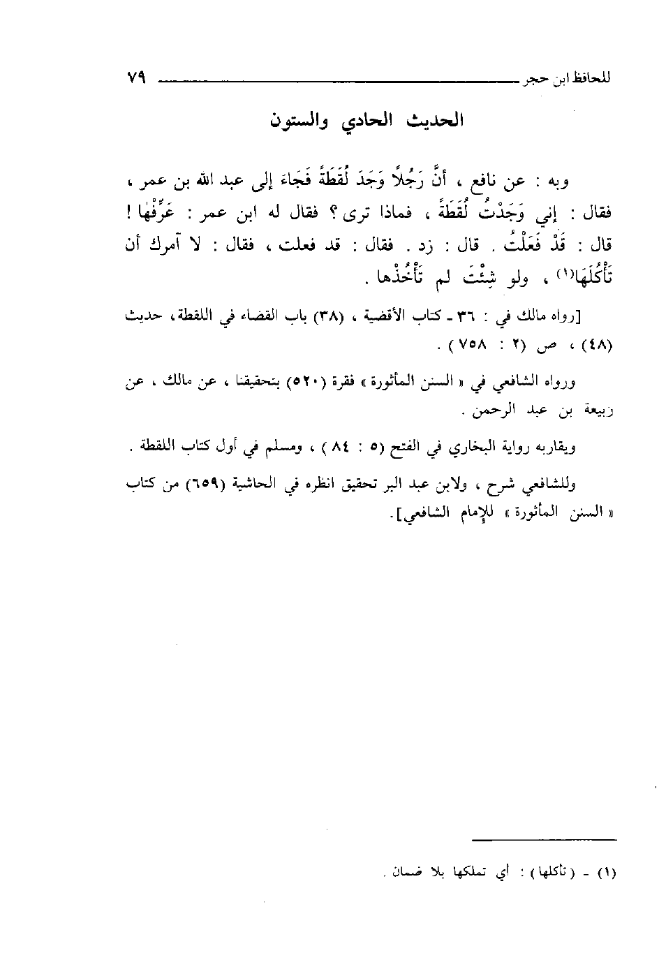 61 - وَبِه عَن نَافِع أَن رجلا وجد لقطَة فجَاء إِلَى عبد الله بن عمر فَقَالَ إِنِّي وجدت لقطَة فَمَاذَا ترى فَقَالَ لَهُ ابْن عمر عرفهَا قَالَ قد فعلت قَالَ زد فَقَالَ قد فعلت فَقَالَ لَا آمُرك أَن تأكلها وَلَو شِئْت لم تأخذها