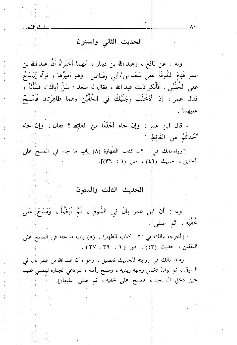 62 - وَبِه عَن نَافِع وَعبد الله بن دِينَار أَنَّهُمَا أخبراه أَن عبد الله بن عمر قدم الْكُوفَة على سعد بن أبي وَقاص وَهُوَ أميرها فَرَآهُ يمسح على الْخُفَّيْنِ فَأنْكر ذَلِك عبد الله فَقَالَ لَهُ سعد سل أَبَاك فَسَأَلَهُ فَقَالَ عمر إِذا أدخلت رجليك فِي الْخُفَّيْنِ وهما طاهرتان فامسح عَلَيْهِمَا