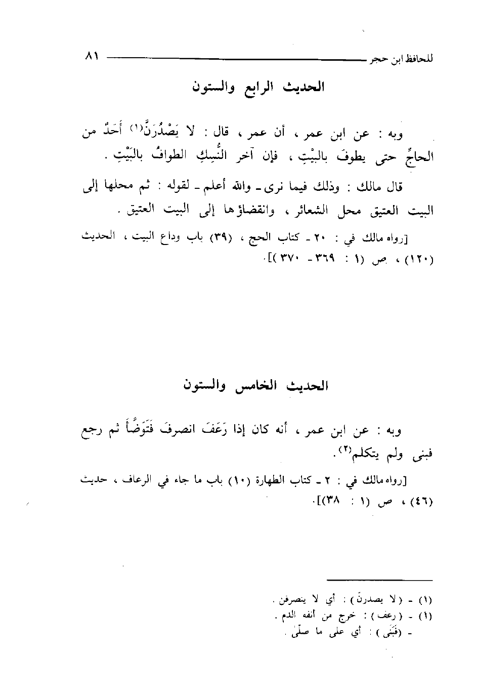 64 - وَبِه عَن ابْن عمر أَن عمر قَالَ لَا يصدرن أحد من الْحَاج حَتَّى يطوف بِالْبَيْتِ فَإِن آخر النّسك الطّواف بِالْبَيْتِ