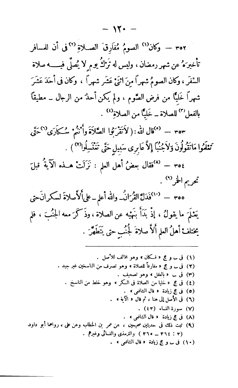 فدل القُرَآن - والله أعلم - على ألا صلاة لسكرانَ حتى يعلمَ ما يقول، إذْ بدأ بنهيه عن الصلاة، وذكر معه الجُنُبَ، فلم يختلف أهل العلم ألا صلاة لجُنُب حتى يَتَطَهَّرَ.