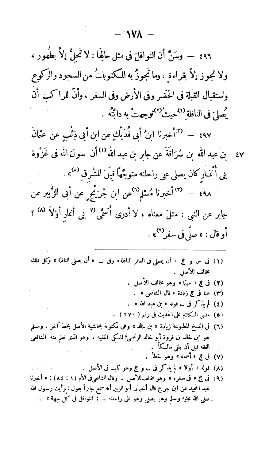 وسن أنَّ النَّوَافِلَ في مِثْل حالها، لا تَحِلُّ إلاَّ بِطُهُورٍ، ولا تجوز إلا بقِراءة، وما تجوز به المكتوباتُ من السجود والركوع واستقبال القبلة في الحَضر وفي الأرْض وفي السفر، وأنَّ للرَّاكِب أنْ يصلِيَ في النَّافِلة حيث توجَّهَتْ بِه دابَّتُهُ.