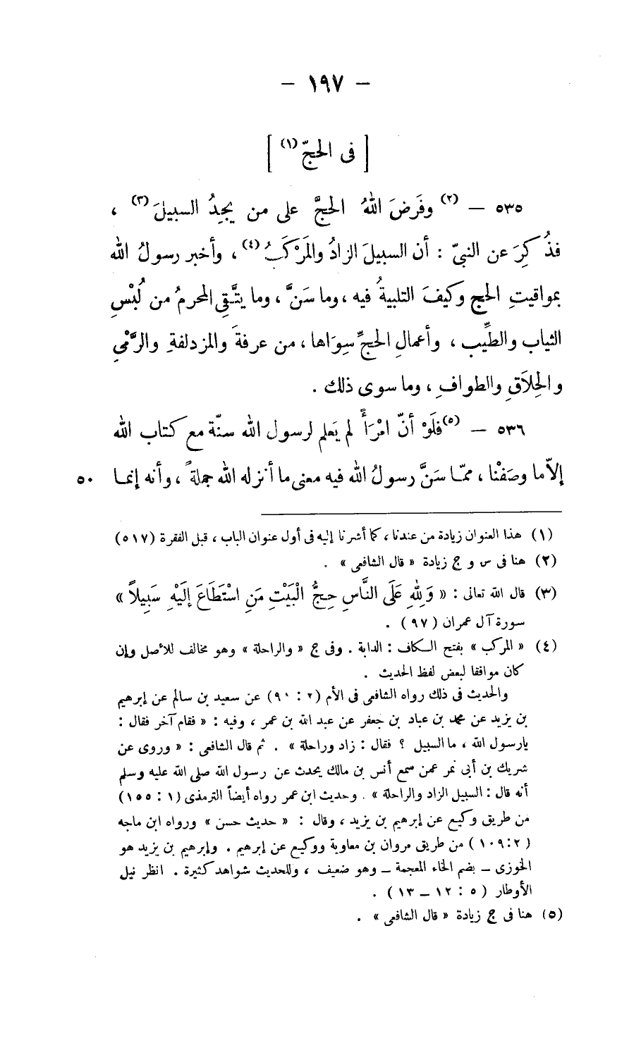 وفَرَضَ اللهُ الحجَّ على من يَجد السبيلَ، فَذُكِر عن النبي: أن السبيلَ الزَّادُ والمَرْكَب، وأخْبَرَ رسولُ الله بمَواقيتِ الحج وكيف التَّلْبِيَةُ فيه، وما سَنَّ، وما يَتَّقِي المُحرمُ مِن لُبْسِ الثِّياب والطِّيب، وأعمالِ الحج سِواها، مِن عرفةَ والمزدلفةِ والرَّميِ والحِلاَقِ والطواف، وما سِوى ذلك.