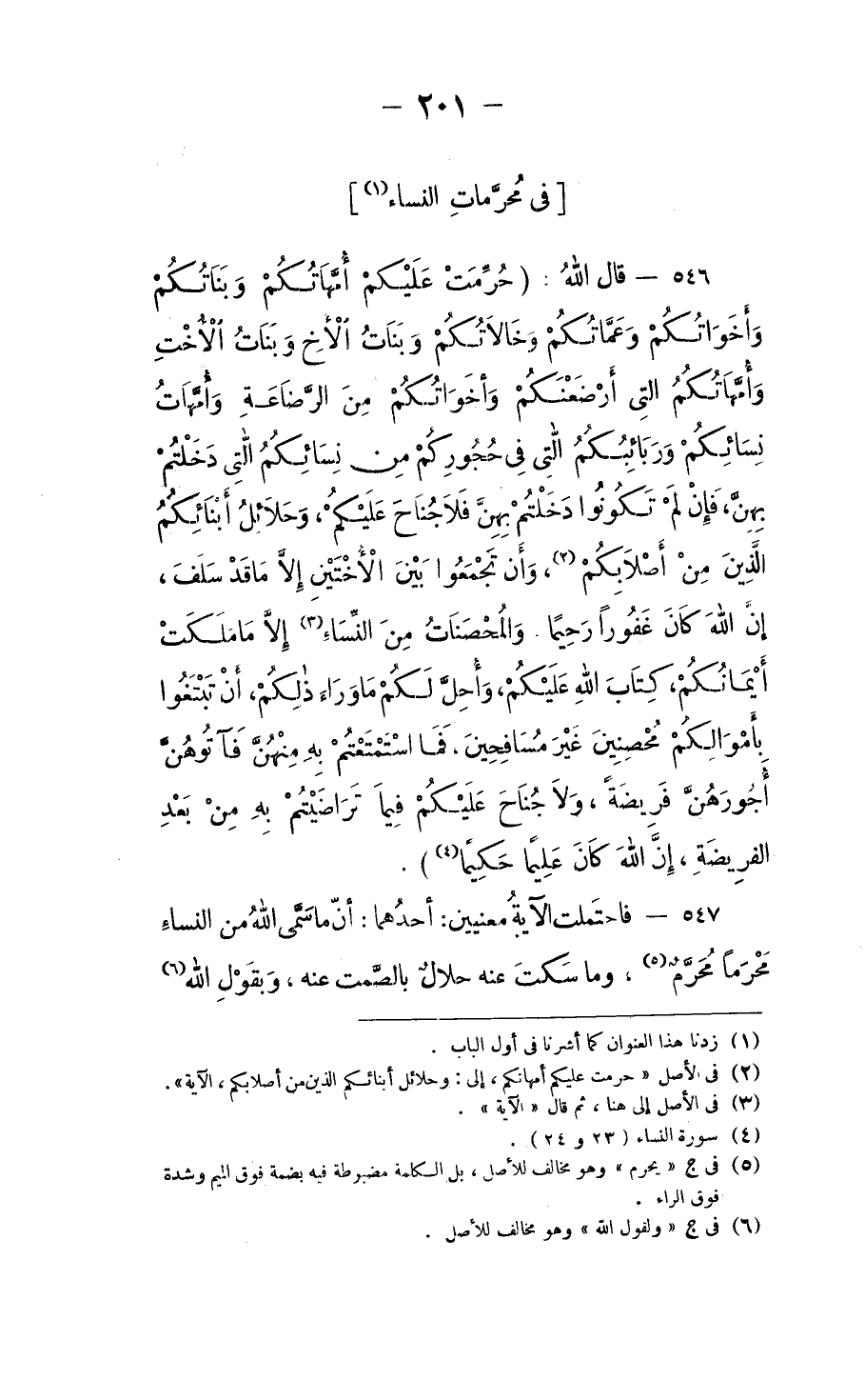 فاحتملت الآية مَعْنَيَيْن: أحدُهما: أنَّ ما سَمَّى اللهُ مِن النِّساء مَحْرَمًا مُحَرَّمٌ، وَما سَكَتَ عنه حَلالٌ بالصَّمْت عنه، وبقول الله: ⦗٢٠٢⦘ " وَأُحِلَّ لَكُمْ مَا وَرَاءَ ذَلِكُمْ "، وكان هذا المعنى هو الظاهرَ مِن الآيَة.