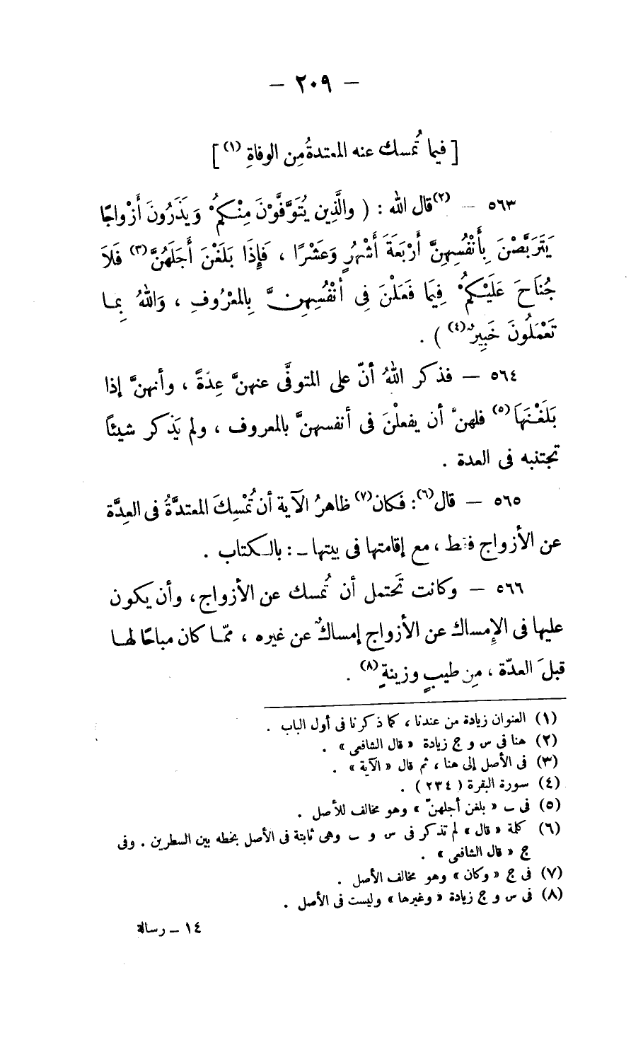 ⦗٢١٠⦘ فلَمَّا سَنَّ رسولُ الله على المُعْتَدَّة مِن الوفاة الإمساك عن الطِّيبِ وغَيْرِه، كان عليها الإمساكُ عن الطيب وغيره بِفَرْض السُّنَّة، والإمساكُ عن الأزواج والسُّكْنَى في بَيْت زوْجها بالكتاب ثم السُّنة.