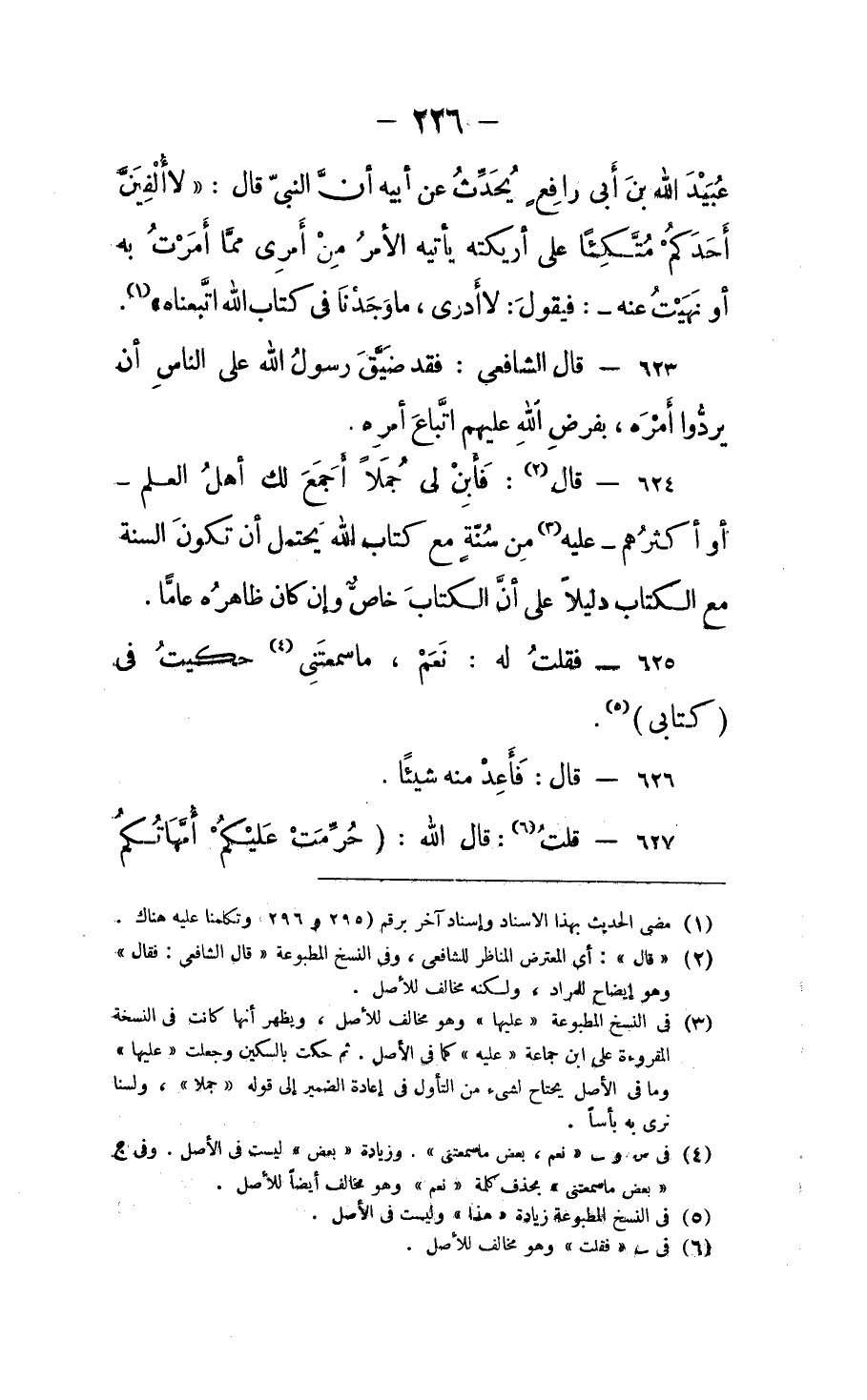 قال: وذَكَرَ اللهُ مَنْ حَرَّمَ، ثم قال: " وَأُحِلَّ لَكُمْ مَا وَرَاءَ ذَلِكُمْ "، فقال رسولُ الله: " لاَ يُجْمَعُ بَيْنَ المَرْأَةِ وَعَمَّتِهَا، وَلاَ بَيْنَ المَرْأَةِ وَخَالَتِهَا " (١) ، فلمْ أَعْلَمْ مُخالِفًا في اتِّباعِه.