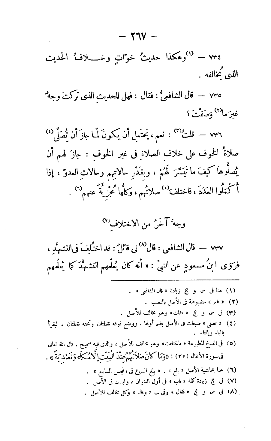 قال "الشافعي": قال لي قائل: قد اختُلِفَ في التَّشَهُّدِ، فرَوَى "ابن مسعود" عن النبي: " أنَّهُ كَانَ يُعَلِّمُهُمْ التَّشَهُّدَ كَمَا يُعَلِّمُهُمْ ⦗٢٦٨⦘ السُّورَةَ مِنَ القُرَآن "، فقال في مُبْتَدَاهُ ثلاث كلماتٍ: " التَّحِيَّاتُ لِلَّهِ "، فَبِأيِّ التشهد أخَذْتَ؟