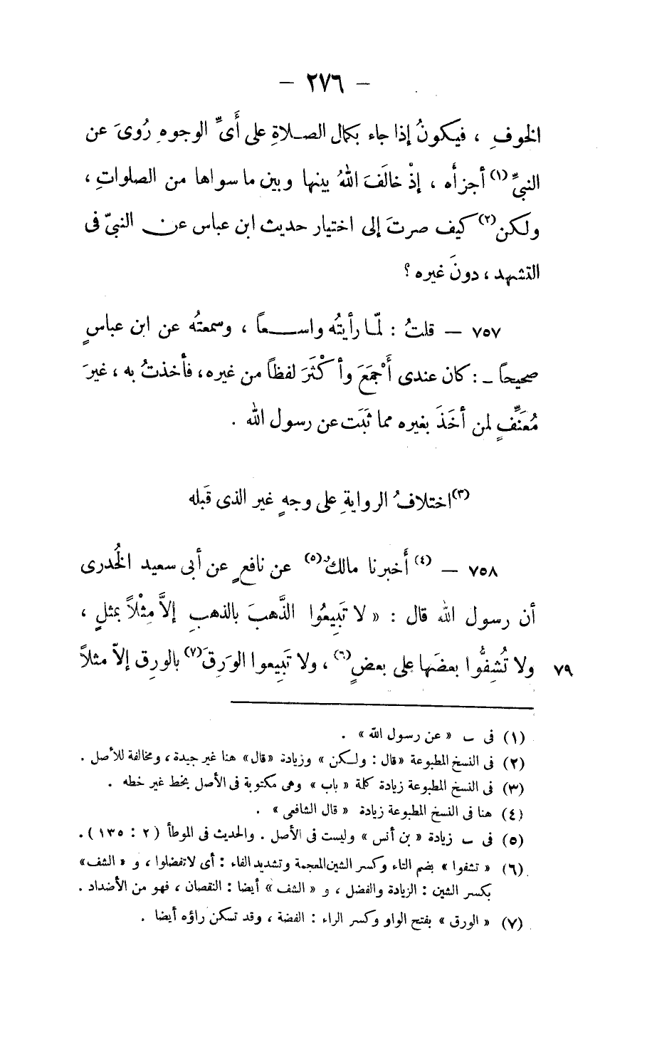 أخبرنا "مالك" عن "نافع" عن "أبي سعيد الخدري" أنَّ رسولَ الله قال: " لاَ تَبِيعُوا الذَّهَبَ بِالذَّهَبِ إلاَّ مِثْلاً بِمِثْلٍ، وَلاَ تُشِفُّوا (١) بَعْضَهَا عَلَى بَعْضٍ، وَلاَ تَبِيعُوا الوَرِقَ (٢) بِالوَرِقِ إلاَّ مِثْلًا ⦗٢٧٧⦘ بِمِثْلٍ، وَلاَ تُشِفُّوا بَعْضَهَا عَلَى بَعْضٍ، وَلاَ تَبِيعُوا شَيْئًا مِنْهَا غَائِبًا بِنَاجِزٍ (٣) " (٤) .