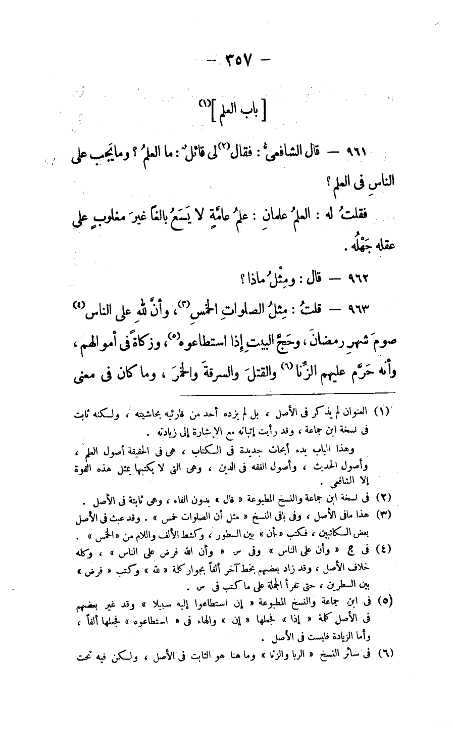 فقلت له: العلم عِلْمان: علمُ عامَّةٍ، لا يَسَعُ بالِغاً غيرَ مغلوب على عقْلِه جَهْلُهُ.