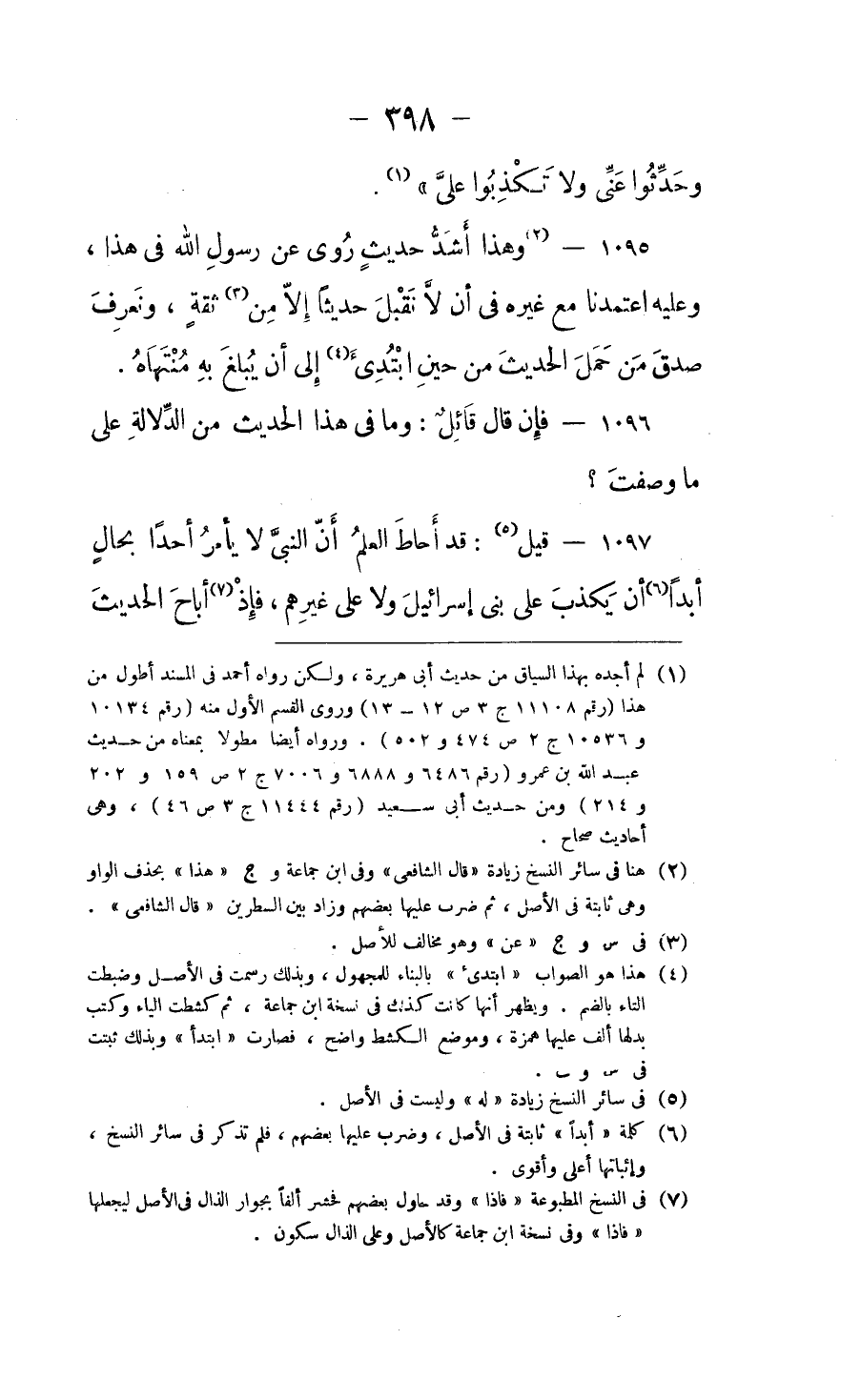 قيل: قد أحاط العلم أن النبي لا يأمر أحداً بحال أبداً أن يكذب على بني إسرائيل، ولا على غيرهم، فإذ أباح الحديث ⦗٣٩٩⦘ عن بني إسرائيل أن يقبلوا الكذب على بني إسرائيل أباح، وإنما أباح قبول ذلك عن من حدَّث به ممن يُجهل صدقه وكذبه.