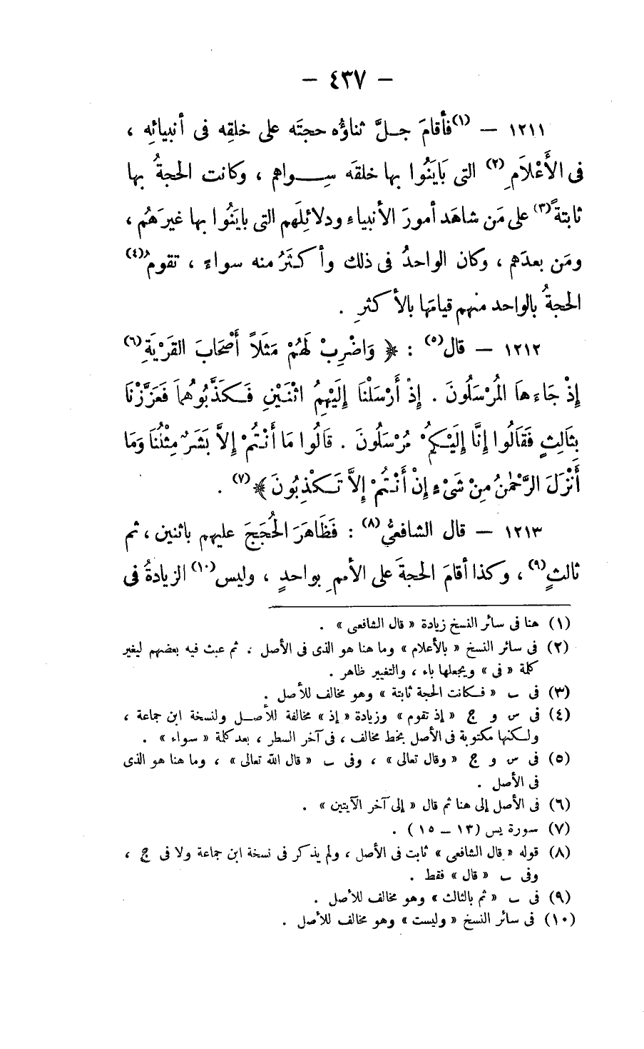 قال "الشافعي": فَظَاهَرَ الحُجَجَ عليهم باثنين، ثم ثالثٍ، وكذا أقام الحجةَ على الأمم بواحد، وليس الزيادة في ⦗٤٣٨⦘ التأكيدِ مانعةً أن تقوم الحجة بالواحد، إذ أعطاه ما يبايِنُ به الخلْق غيرَ النبيين.