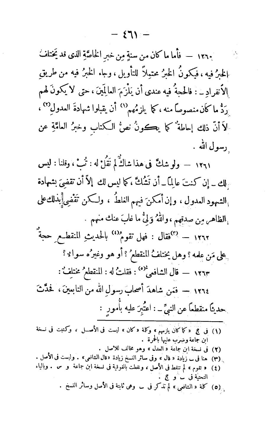 فأما ما كان من سنة من خبر الخاصة الذي يختلف الخبر فيه، فيكون الخبر محتملاً للتأويل، وجاء الخبر فيه من طريق الانفراد: فالحجة فيه عندي أن يلزم العالمين حتى لا يكون لهم ردُّ ما كان منصوصاً منه، كما يلزمهم أن يقبلوا شهادة العدول، لا أن ذلك إحاطةٌ كما يكون نص الكتاب وخبرُ العامة عن رسول الله.