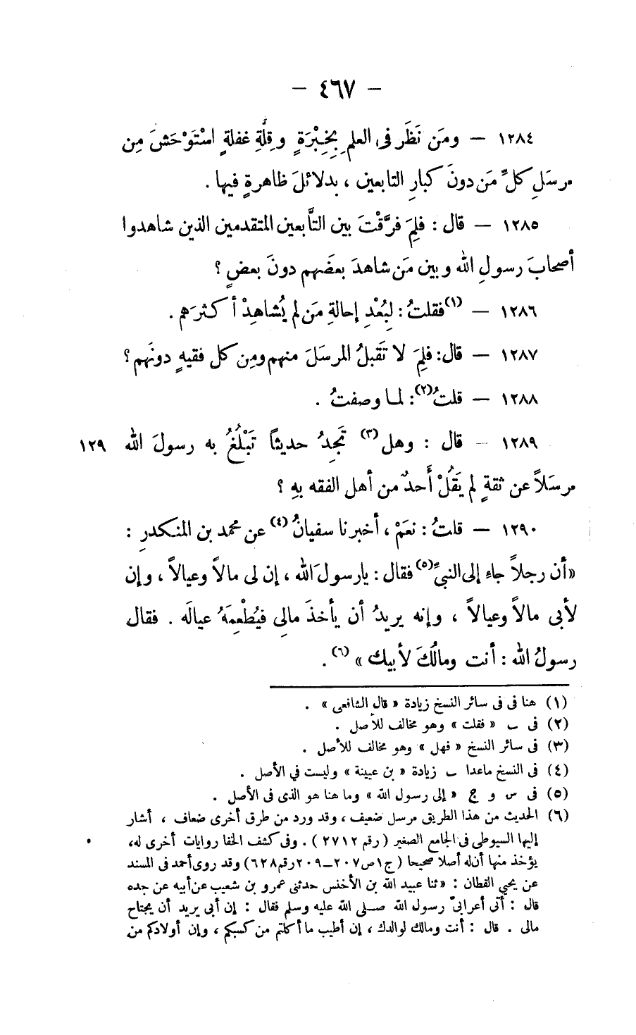 قلت: نعم، أخبرنا سفيان عن محمد بن المنكدر: أن رجلاً جاء الى النبي، فقال: يا رسول الله! إن لي مالاً وعيالاً، وإن لأبي مالاً وعيالاً، وإنه يريد أن يأخذ مالي، فيُطعِمَهُ عياله. فقال رسول الله: "أنت ومالك لأبيك". (١)