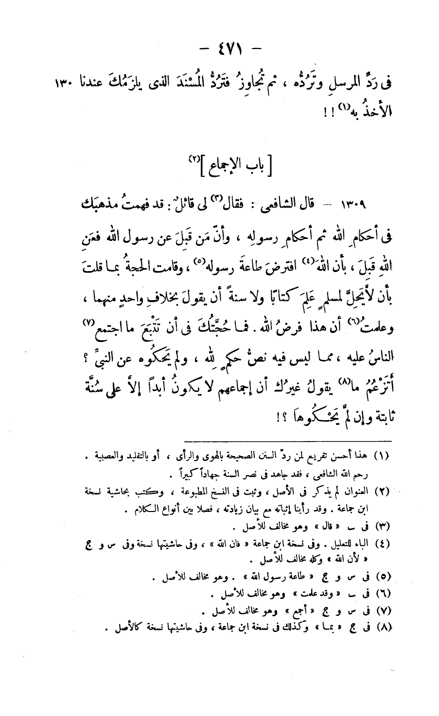 قال "الشافعي": فقال لي قائل: قد فهمتُ مذهبك في أحكام الله، ثم أحكام رسوله، وأن من قَبِل عن رسول الله، فعن الله قَبِل، بأن الله افترض طاعة رسوله، وقامت الحجة بما قلتَ بأن لا يحلَّ لمسلم عَلِمَ كتاباً ولا سنة أين يقول بخلاف واحد منهما، وعلمتُ أن هذا فرضُ الله. فما حجتك في أن تَتْبع ما اجتمع الناس عليه مما ليس فيه نص حكم لله، ولم يحكوه عن النبي؟ أتزعُمُ ما يقول غيرك أن إجماعهم لا يكون أبداً إلا على سنة ثابتة، وإن لم يحكوها؟!