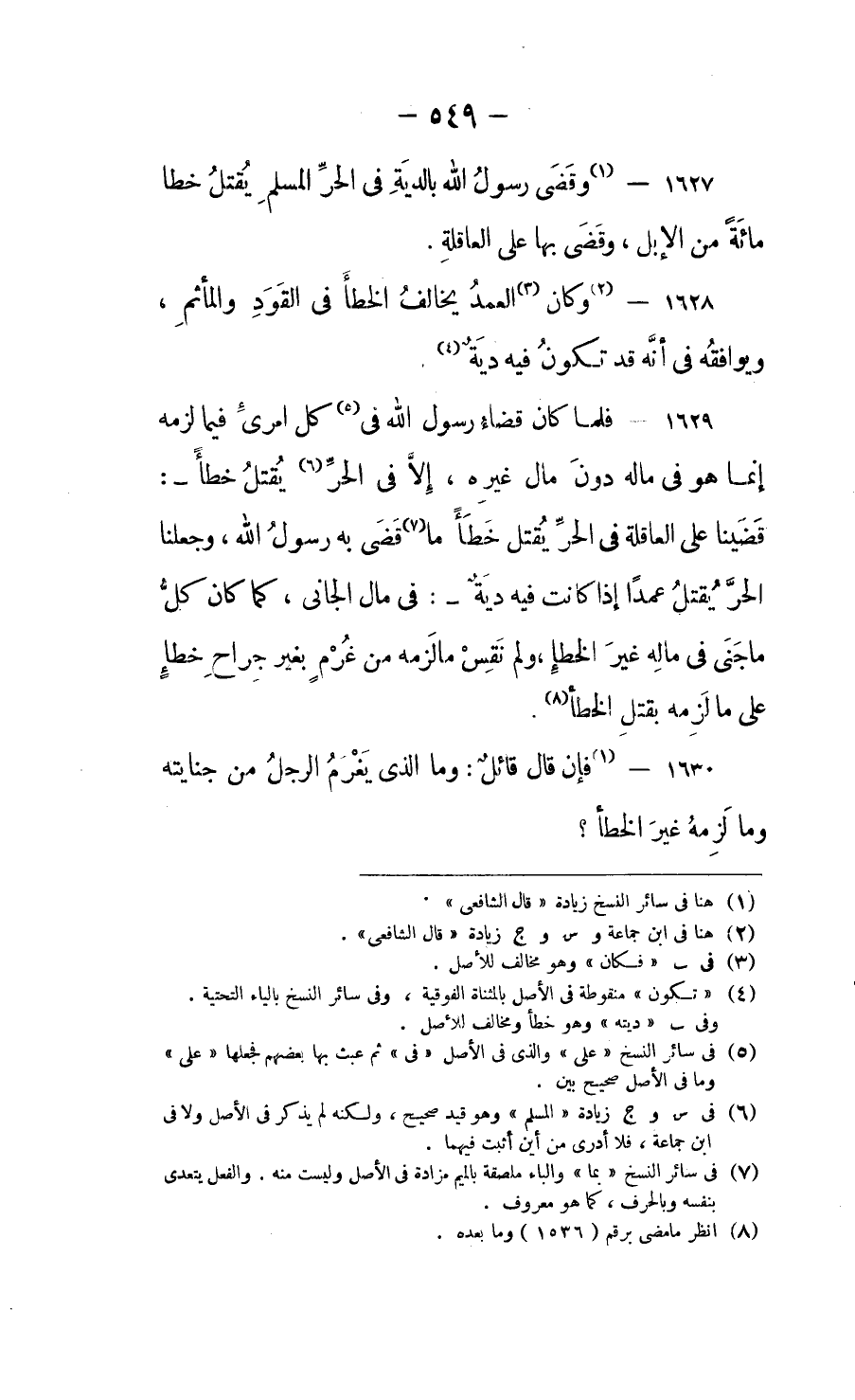 فلما كان قضاء رسول الله في كل امرئ فيما لزمه، إنما هو في ماله دون مال غيره، إلا في الحر يُقتل خطأ: قضينا على العاقلة في الحر يُقتل خطأ ما قضى به رسول الله، وجعلنا الحر يُقتل عمدا إذا كانت فيه دية: في مال الجاني، كما كان كل ما جنى في ماله غيرَ الخطأ، ولم نقس ما لزمه من غُرْم بغير جراح خطأٍ على ما لزمه بقتل الخطأ.