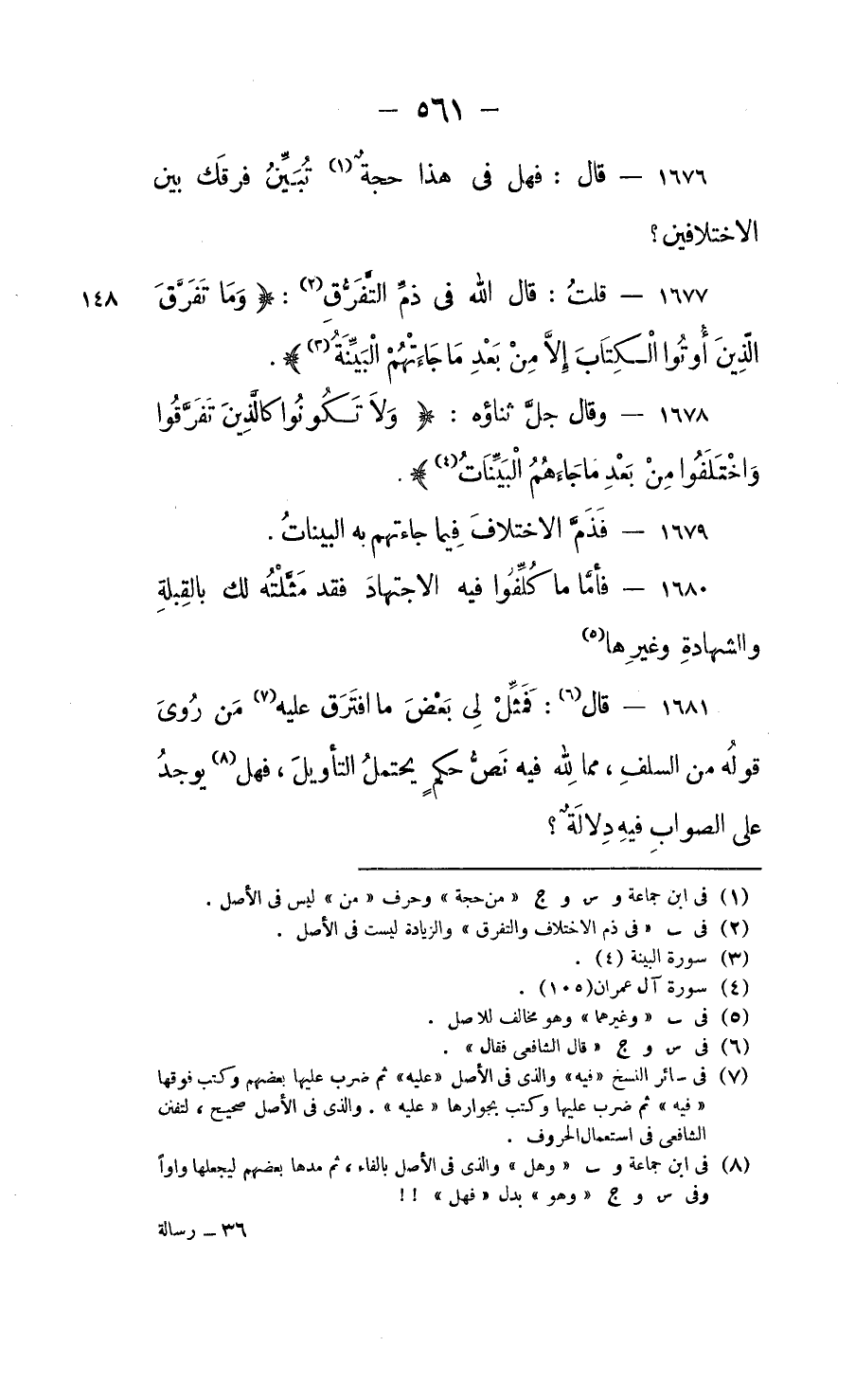 ⦗٥٦٢⦘ قلت: قَلَّ ما اختلفوا فيه إلا وجدنا فيه عندنا دِلالة من كتاب الله أو سنة رسوله، أو قياساً عليهما، أو على واحد منهما.